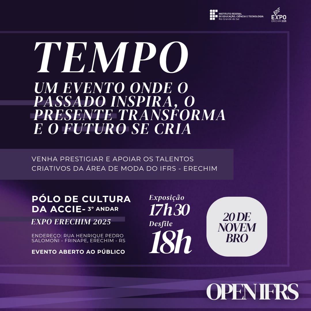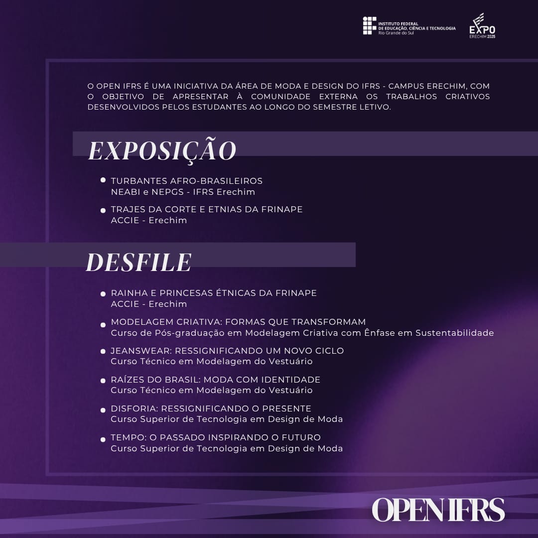 No dia 20 de novembro de 2025, a área de Moda e Design do Campus Erechim do Instituto Federal do Rio Grande do Sul (IFRS) apresenta o OPEN IFRS, tradicional desfile de encerramento do semestre, no 3º andar do Polo de Cultura da ACCIE, na Frinape. O evento é parte da programação da Expo Erechim 2025, que ocorre entre os dias 19 e 23 de novembro. A entrada é gratuita.