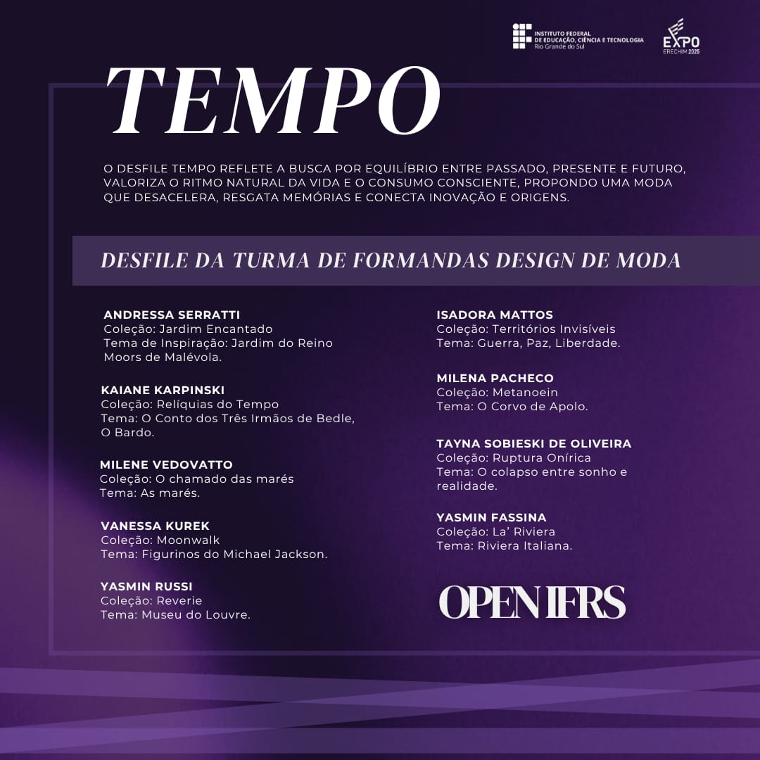 Já os desfiles têm início às 18h, com produções desenvolvidas por estudantes do curso técnico, superior e de pós-graduação da área (saiba mais nas imagens). Na sequência, as formandas do curso de Tecnologia em Design de Moda desfilam suas coleções finais, que tem como tema o “tempo”, buscando equilíbrio entre passado, presente e futuro através de uma moda que busca desacelerar, resgatar memórias e conectar inovação e origens.
