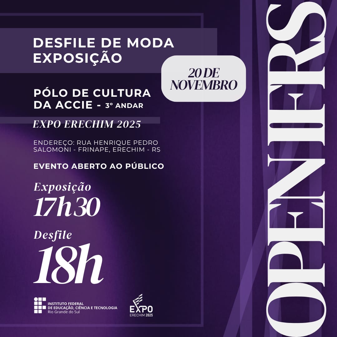 No dia 20 de novembro de 2025, a área de Moda e Design do Campus Erechim do Instituto Federal do Rio Grande do Sul (IFRS) apresenta o OPEN IFRS, tradicional desfile de encerramento do semestre, no 3º andar do Polo de Cultura da ACCIE, na Frinape. O evento é parte da programação da Expo Erechim 2025, que ocorre entre os dias 19 e 23 de novembro. A entrada é gratuita.