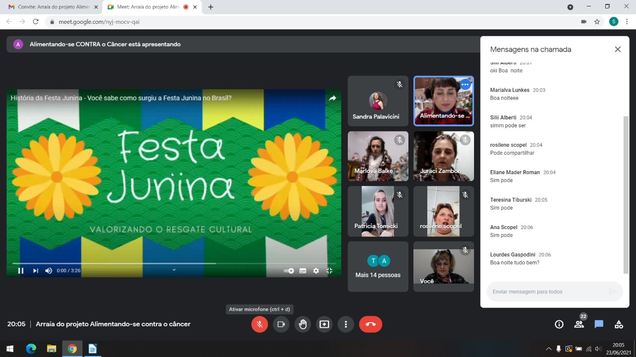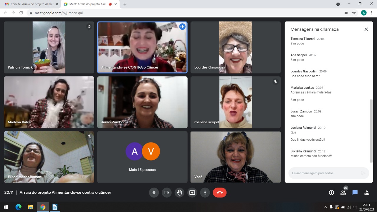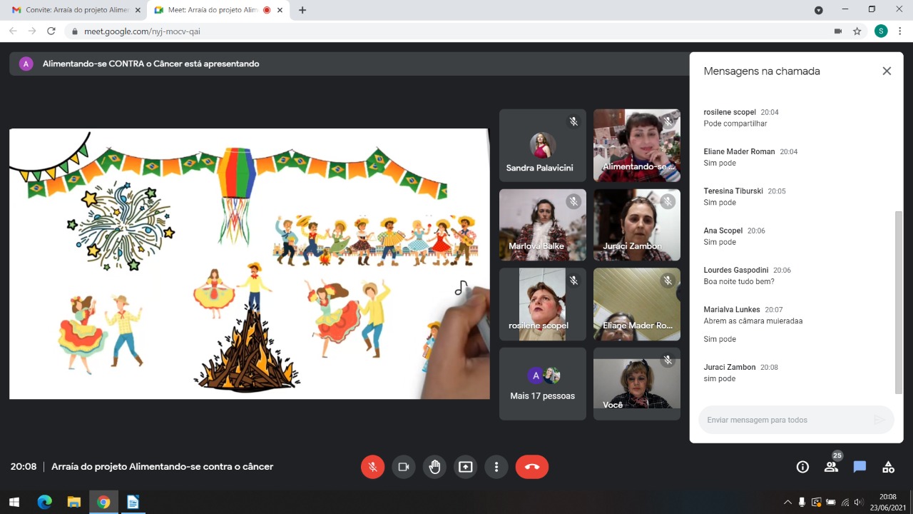 Para finalizar o projeto em grande estilo aproveitou-se as comemorações Juninas realizando assim um Arraía online com a participação das inscritas no projeto tipicamente trajadas e maquiadas, e trazendo para a sala do Meet uma vasta alimentação tradicional de festa Junina. Conforme a Coordenadora do projeto: “Aproveitamos esta data tradicional e de um cunho alimentar fortíssimo para fazer o encerramento do projeto de uma forma alegre em meio a essa situação pandêmica, onde cada uma, na sua casa compartilhou pipoca, pinhão, rapadura, batata doce, bolo de milho, quentão e músicas típicas… inclusive alguns desses alimentos estão no rol de alimentos preventivos ao câncer.”