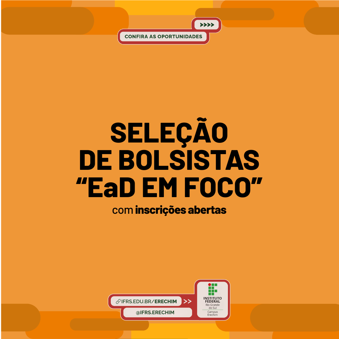 Estão abertas as inscrições para a seleção de bolsistas do projeto “EaD em Foco: Apoio Pedagógico, Tecnológico e Acessibilidade nos Ambientes Virtuais de Aprendizagem do IFRS”. O prazo para participar vai até 20 de março de 2026. Estão disponíveis 02 (duas) vagas, com bolsas de 16 horas semanais no valor de R$700,00 cada uma.