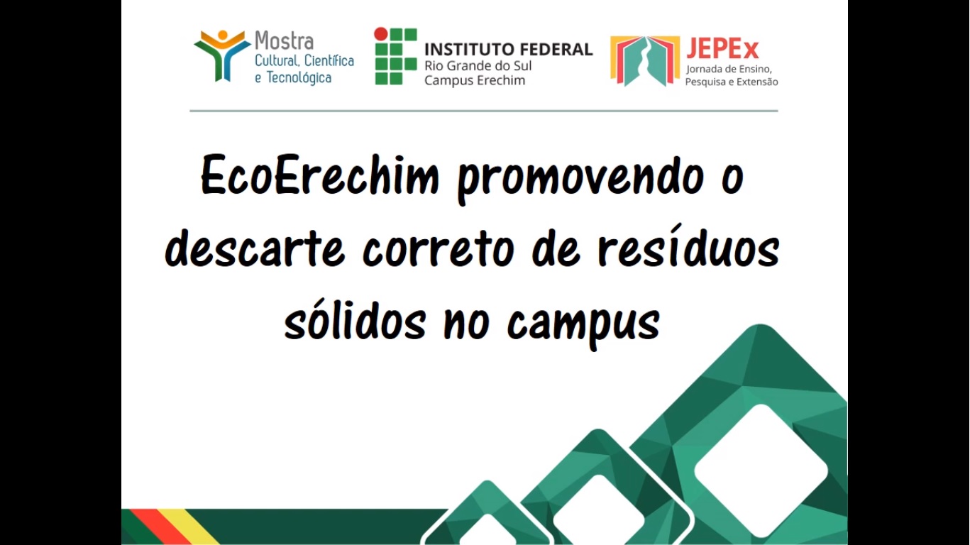 O projeto “ EcoErechim promovendo o descarte correto de resíduos sólidos no campus” foi apresentado na 9ª JEPEX e 3ª Mostra Cultural – IFRS Erechim pela aluna Tainara Biavatti, e orientado pela coordenadora do projeto, professosa Denise Olkoski.