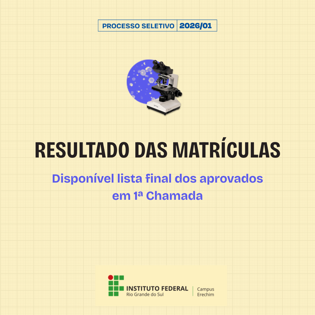 Nesta quinta-feira, dia 22 de janeiro, foram publicados, no site ingresso.ifrs.edu.br, os resultados finais das matrículas em Primeira Chamada (Sorteio e Prova) do Processo Seletivo de Estudantes 2026/1 do Campus Erechim do Instituto Federal de Educação, Ciência e Tecnologia do Rio Grande do Sul (IFRS).