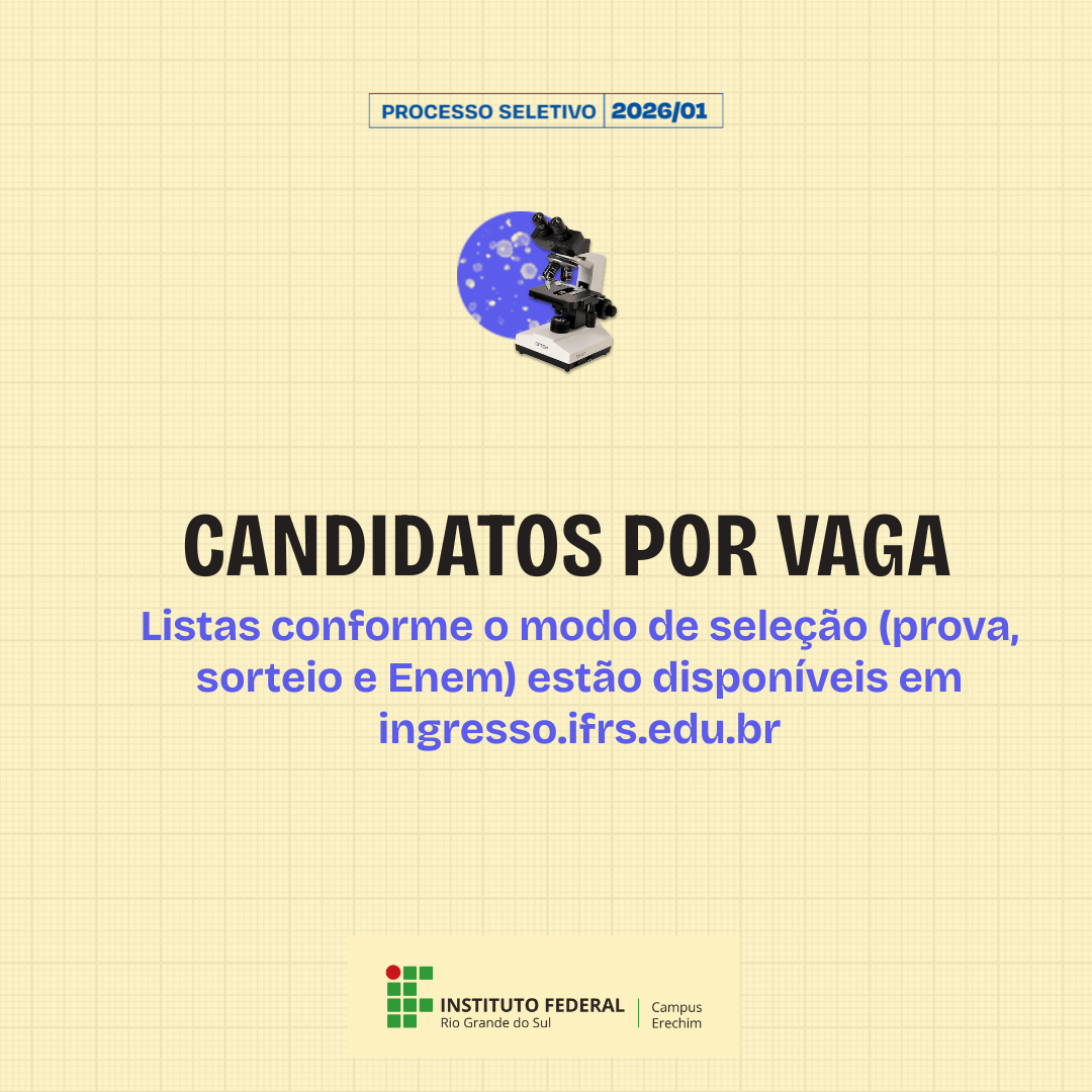 Foi divulgada a relação de candidatos por vaga no Processo Seletivo de estudantes 2026/01 do Instituto Federal de Educação, Ciência e Tecnologia do Rio Grande do Sul (IFRS). As listas estão organizadas conforme a forma de seleção (prova, sorteio ou nota do Enem) e o campus e podem ser acessadas no site ingresso.ifrs.edu.br.