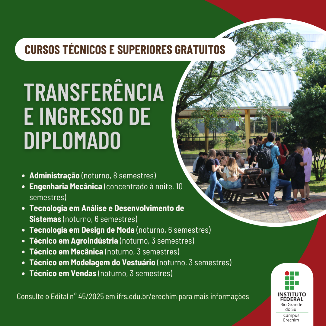 As provas ocorrerão neste domingo, 23 de novembro de 2025, em dois turnos: manhã para os cursos técnicos integrados ao Ensino Médio e à tarde para os cursos superiores Os locais de realização das provas do Processo Seletivo de Estudantes 2026/01 do Instituto Federal de Educação, Ciência e Tecnologia do Rio Grande do Sul (IFRS) estão disponíveis no site ingresso.ifrs.edu.br. Os…