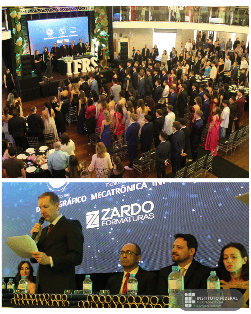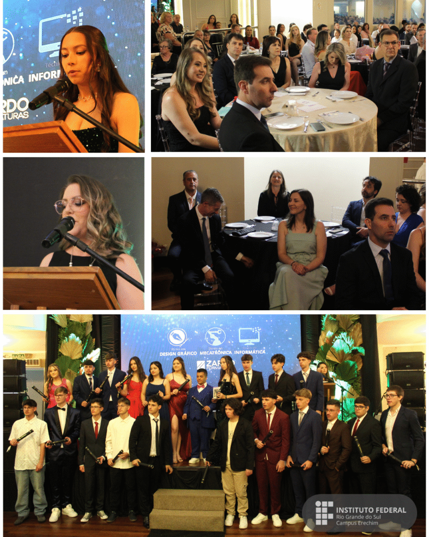 Na noite de 12 de dezembro de 2025, três turmas de técnicos integrados ao ensino médio do IFRS – Campus Erechim realizaram solenidade de conclusão: Técnico em Design Gráfico, Técnico em Informática e Técnico em Mecatrônica. O evento, o qual ocorreu no Salão Social do Clube Esportivo e Recreativo Atlântico de Erechim lotado, foi conduzido pelo diretor-geral do campus, professor Sidnei Dal Agnol, e secretariado pela representante do setor de Registros Acadêmicos, servidora técnico-administrativa, Marlova Elisabete Balke. Participou também o diretor de ensino do campus, professor Ernani Gottardo.