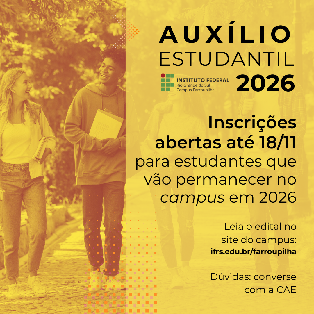 O Auxílio Permanência e Moradia do Período Letivo (também conhecido por Auxílio Estudantil) está com inscrições abertas aos estudantes do IFRS – Campus Farroupilha. Podem se inscrever até 18 de novembro de 2025 os estudantes que vão realizar rematrícula para o ano letivo de 2026 ou permanecerão regularmente matriculados no próximo ano.