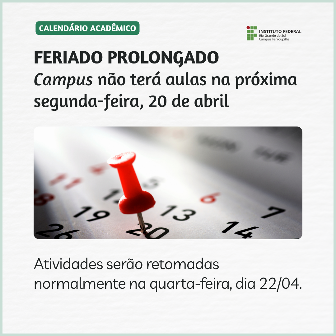 O IFRS – Campus Farroupilha comunica à comunidade acadêmica e ao público externo que não haverá expediente nem atividades letivas nos dias 20 e 21 de abril de 2026. A pausa ocorre em virtude do feriado nacional de Tiradentes, celebrado na terça-feira (21 de abril), e da previsão de dia não letivo na segunda-feira (20 de abril), conforme o cronograma do calendário acadêmico.