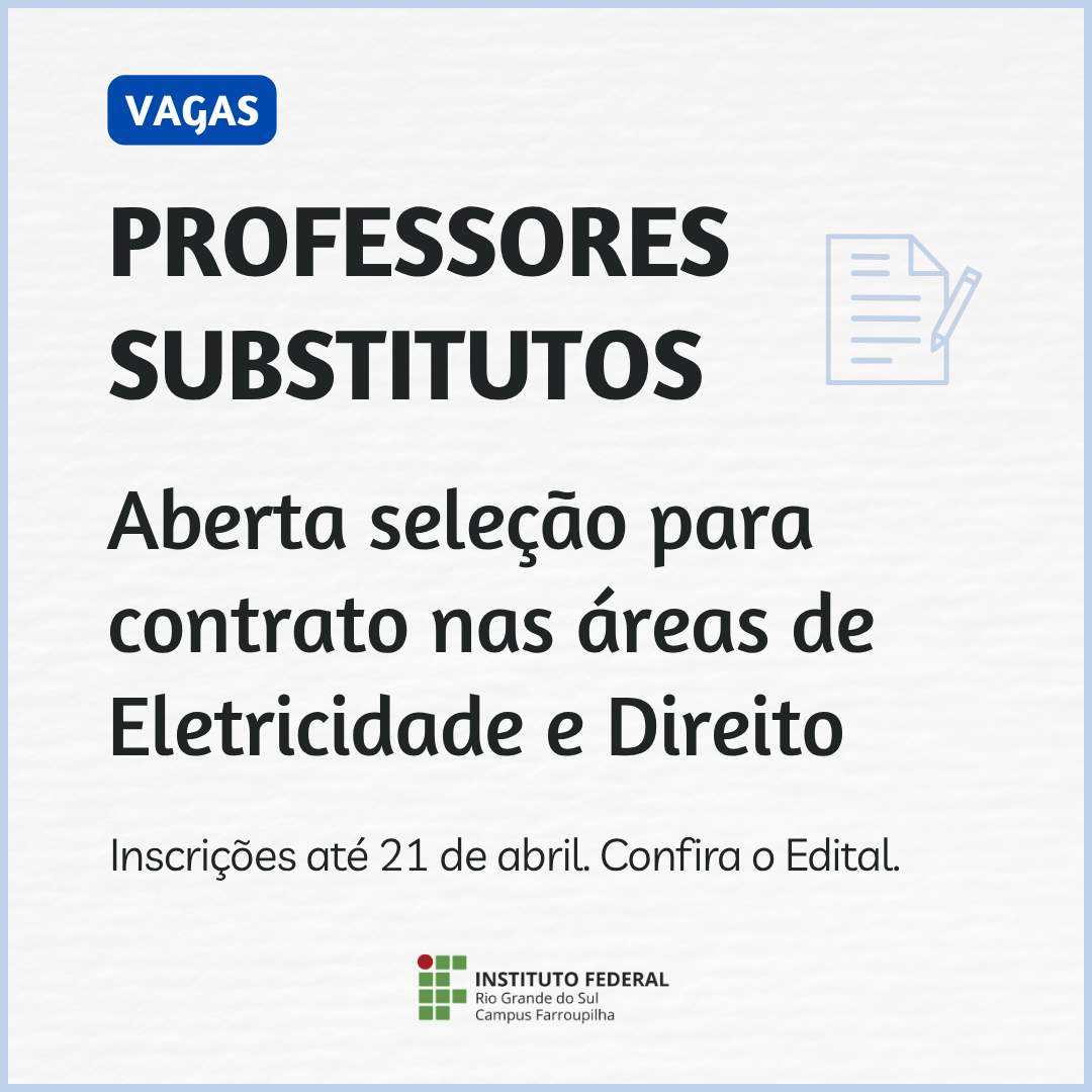 O IFRS – Campus Farroupilha tornou público o Edital nº 13/2026, que regulamenta a realização de Processo Seletivo Simplificado para a contratação de professores substitutos por tempo determinado. O certame visa atender à necessidade temporária de excepcional interesse público nas áreas de Eletricidade e Direito.