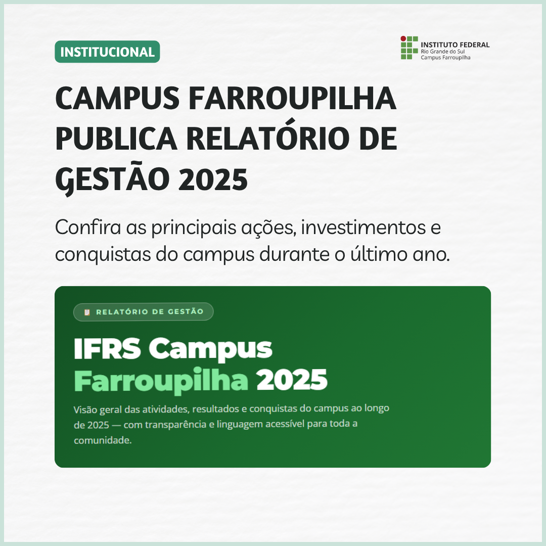 O IFRS – Campus Farroupilha, por meio da Coordenadoria de Desenvolvimento Institucional, disponibilizou o Relatório de Gestão relativo ao ano de 2025. O documento apresenta de forma detalhada como os recursos públicos foram aplicados e quais metas o campus alcançou nas áreas de ensino, pesquisa, extensão e infraestrutura, reafirmando o compromisso com a transparência e a qualidade na educação.