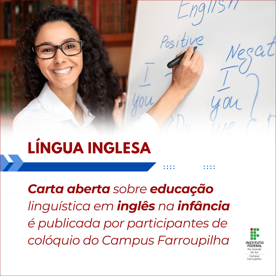 A organização do evento do IFRS – Campus Farroupilha “Educação linguística em língua inglesa na infância: desafios e possibilidades” lança a Carta Aberta à sociedade sobre educação linguística em língua inglesa na infância em Farroupilha/RS. O documento foi elaborado a partir das discussões promovidas pelo colóquio, realizado entre maio e julho de 2025 no campus. A carta reúne reflexões, argumentos e recomendações produzidas pelos participantes do evento, que fez parte do produto educacional do trabalho de conclusão do curso de Mestrado em Educação Básica do estudante Júnior de Arruda sob orientação da professora Lucilene Bender de Sousa.