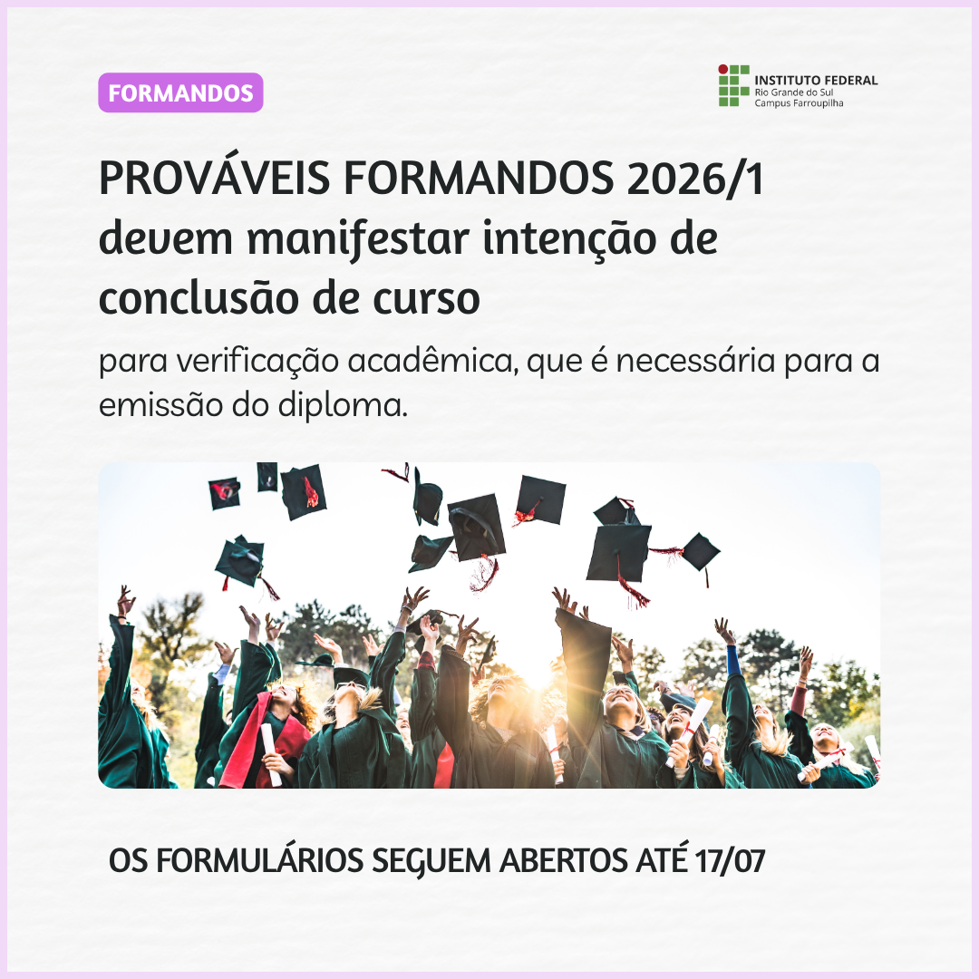 Prováveis formandos do primeiro semestre de 2026: com o objetivo de iniciar a verificação acadêmica, que é necessária para a emissão do diploma e/ou certificado de conclusão de curso, o Setor de Registros Acadêmicos solicita que todos os prováveis concluintes de cursos técnicos subsequentes e superiores do primeiro semestre de 2026 preencham o formulário até o dia 17 de julho de 2026, manifestando a intenção de conclusão do curso.