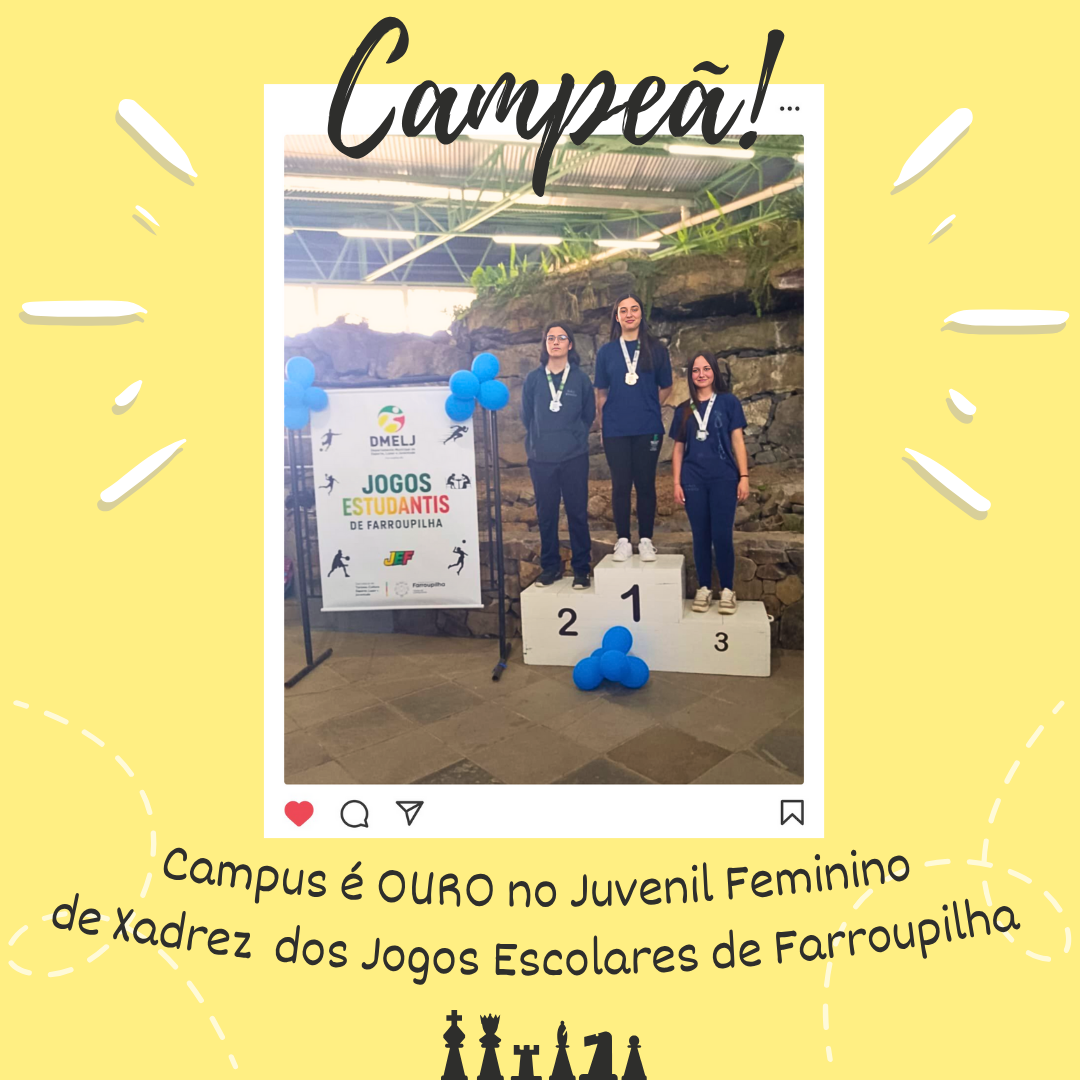 O campus tá ON! Nesta terça-feira, dia 11 de novembro, estudantes do IFRS – Campus Farroupilha participaram da etapa de Xadrez dos Jogos Estudantis de Farroupilha, na categoria Juvenil. A estudante Ana Luísa de Matos de Oliveira, do curso Técnico em Eletromecânica Integrado ao Ensino Médio, conquistou o primeiro lugar no Juvenil Feminino.