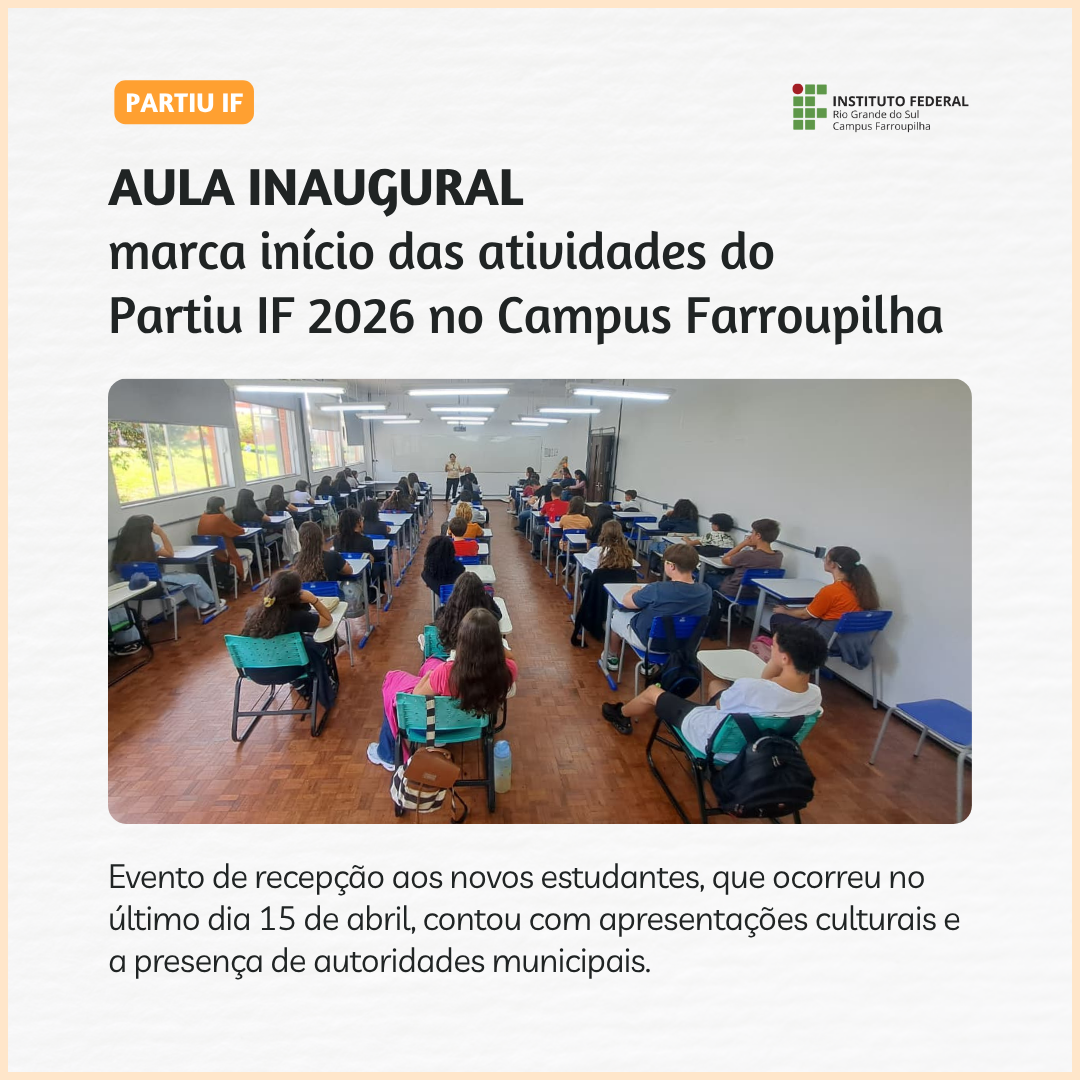 O IFRS – Campus Farroupilha promoveu, na tarde da última quarta-feira, dia 15 de abril, a aula inaugural que deu início às atividades da turma de 2026 do programa Partiu IF. O evento reuniu os 40 novos alunos e a equipe do campus para celebrar o começo dessa jornada de reforço escolar e preparação para o Ensino Médio.