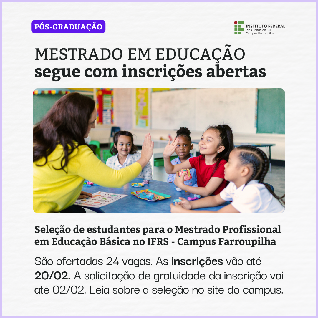 O Instituto Federal do Rio Grande do Sul (IFRS) – Campus Farroupilha está com inscrições abertas no edital de seleção de novos estudantes do Mestrado Profissional em Educação Básica para ingresso em 2026. O processo seletivo está regulamentado pelo Edital nº 54/2025 (que deve ser conferido, clicando aqui).