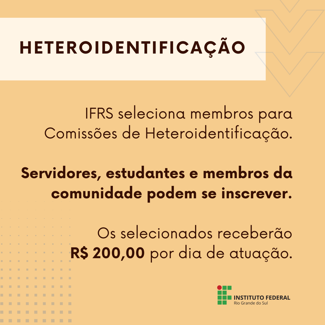 O Instituto Federal do Rio Grande do Sul (IFRS) lançou o Edital PROEN nº 33/2025, que trata da seleção complementar de membros para atuar nas Comissões de Heteroidentificação nos processos seletivos de estudantes, seleções de contratato de docentes, concursos públicos do Instituto etc nos semestres 2026/1 e 2026/2.