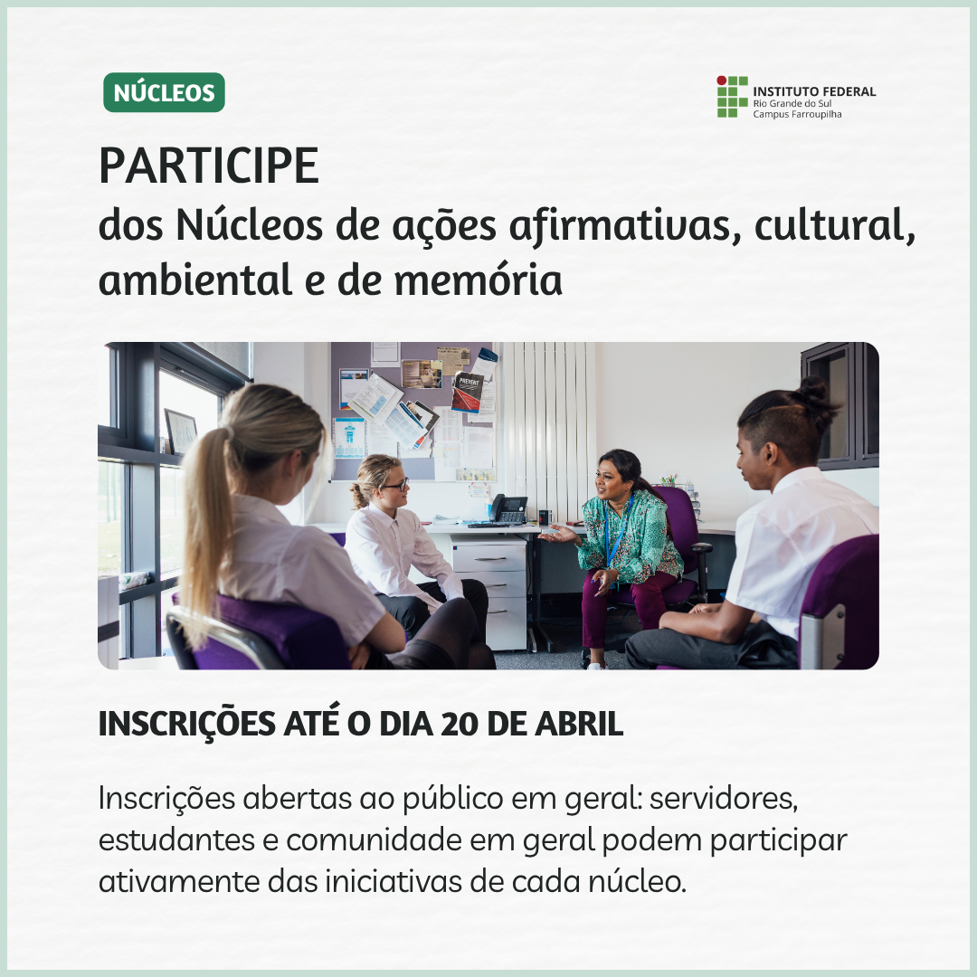 Os núcleos de ações afirmativas, cultural, ambiental e de memória do IFRS – Campus Farroupilha estão com inscrições abertas ao público em geral: servidores, estudantes e comunidade em geral podem participar ativamente das iniciativas de cada núcleo. Conheça, abaixo, as temáticas trabalhadas pelos grupos e inscreva-se aqui até 20 de abril de 2026.