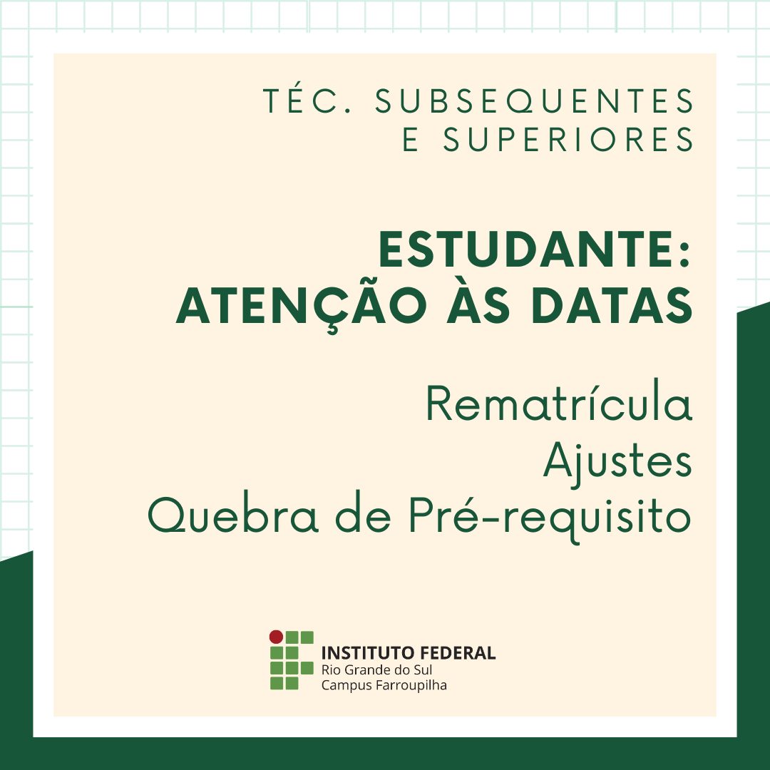 Informamos que o período de rematrículas online ocorrerá de 26 de janeiro a 04 de fevereiro, para estudantes dos Cursos Técnicos Subsequentes, Cursos Superiores e do Mestrado em Educação Básica.