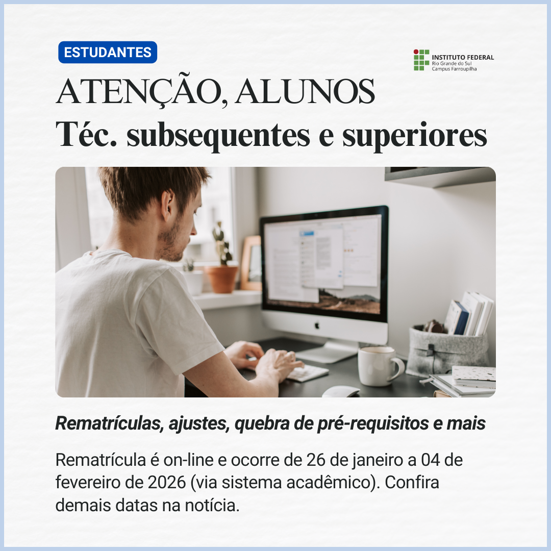 A rematrícula dos alunos dos cursos superiores e técnicos subsequentes é on-line e ocorre de 26 de janeiro a 04 de fevereiro de 2026 (via sistema acadêmico).