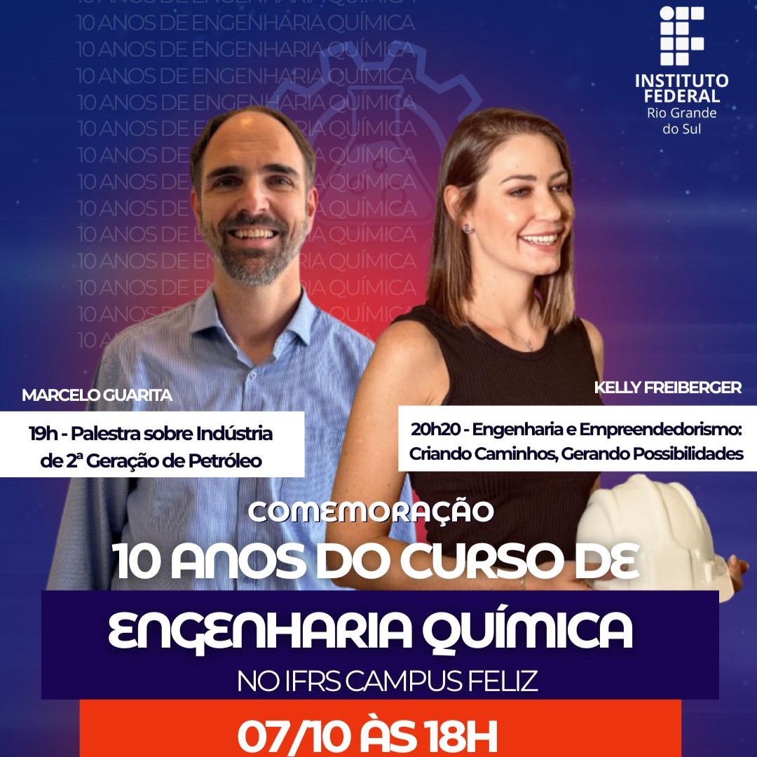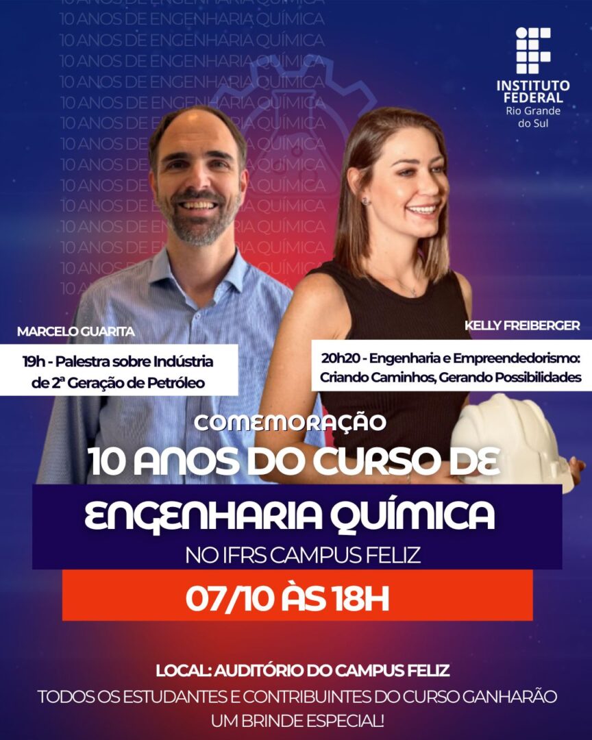 Estudantes e professores do curso de Engenharia Química convidam para o evento em comemoração aos 10 anos do curso no IFRS Campus Feliz.