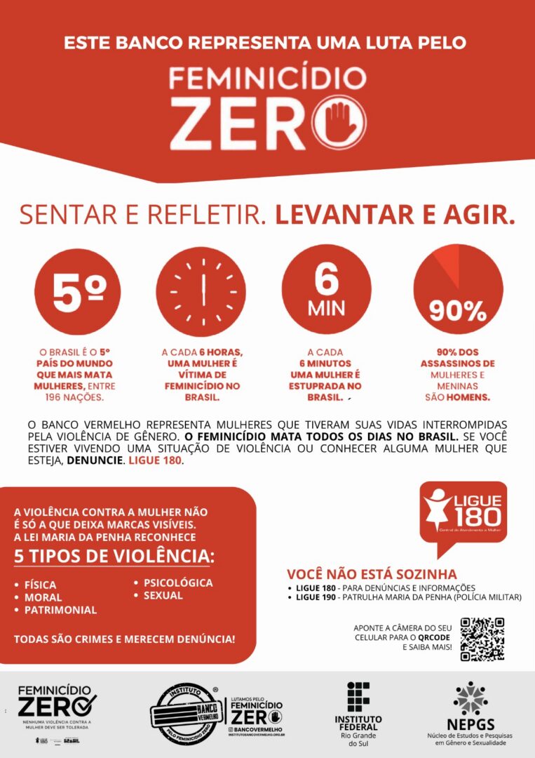 A iniciativa tem origem na mobilização internacional Red Bench Project e foi incorporada formalmente no Brasil por meio da Lei nº 14.942/2024, a qual prevê a sua realização em espaços públicos como símbolo de memória, conscientização e denúncia do feminicídio. As artes dos cartazes utilizados no IFRS foram elaboradas pelo Instituto Banco Vermelho (clique na imagem ao lado para conferi-la de forma ampliada).
