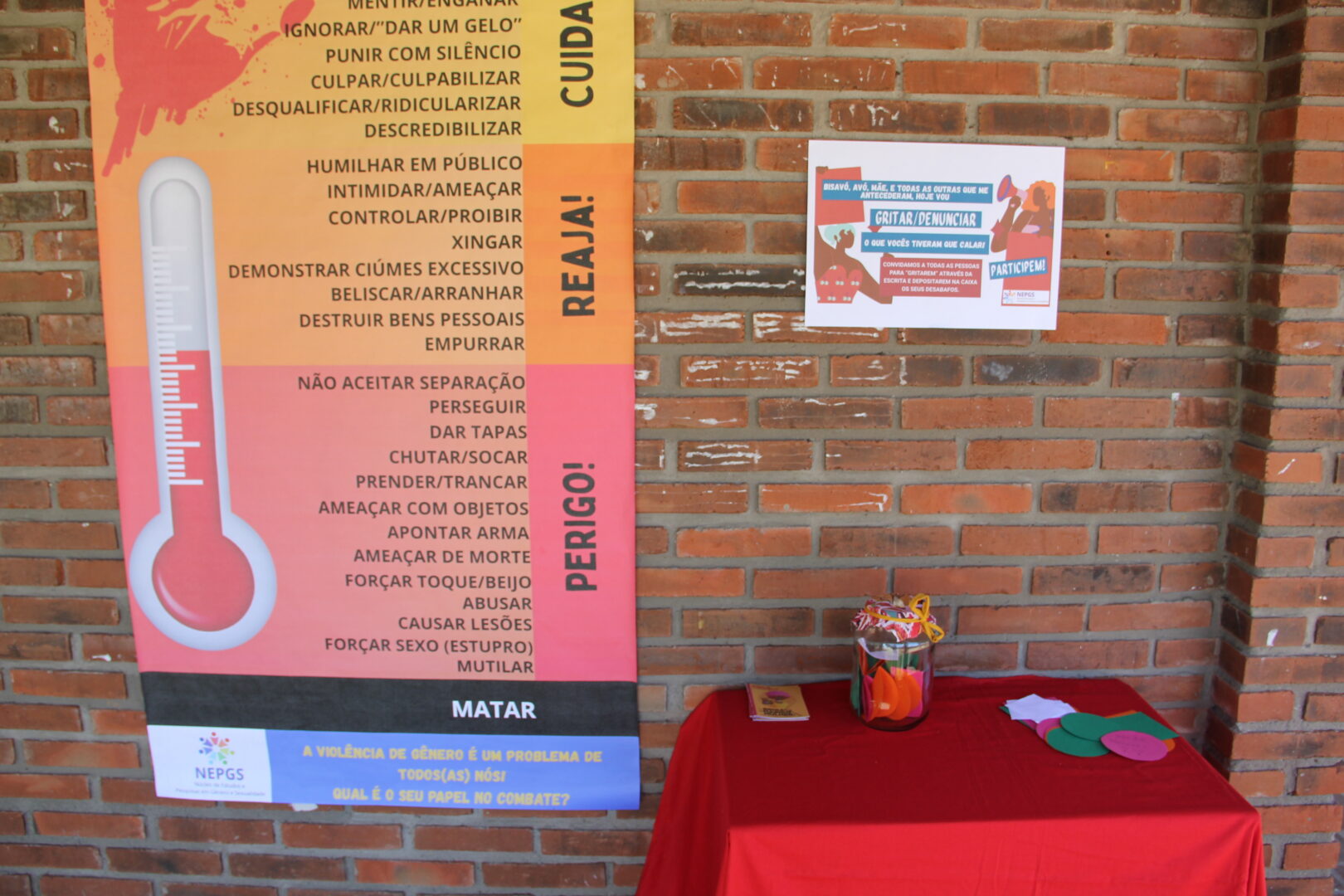Além do banco vermelho, outras intervenções também foram realizadas em diversos locais do campus, possibilitadas através de trabalhos realizados em sala de aula. Cartazes colados nos banheiros e nos corredores chamam a atenção para situações misóginas e frases machistas. A exposição de “Mulheres inovadoras”, aborda perfis de mulheres que contribuíram para a inovação. Sapatos pintados de vermelho também alertam para a violência contra a mulher.