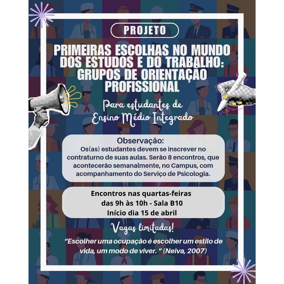 Os grupos de orientação profissional serão realizados semanalmente, totalizando oito encontros para diálogos e reflexões em grupo, mediados pela utilização de técnicas psicológicas, acerca das diversas questões relacionadas às primeiras escolhas profissionais e ao projeto de vida.
