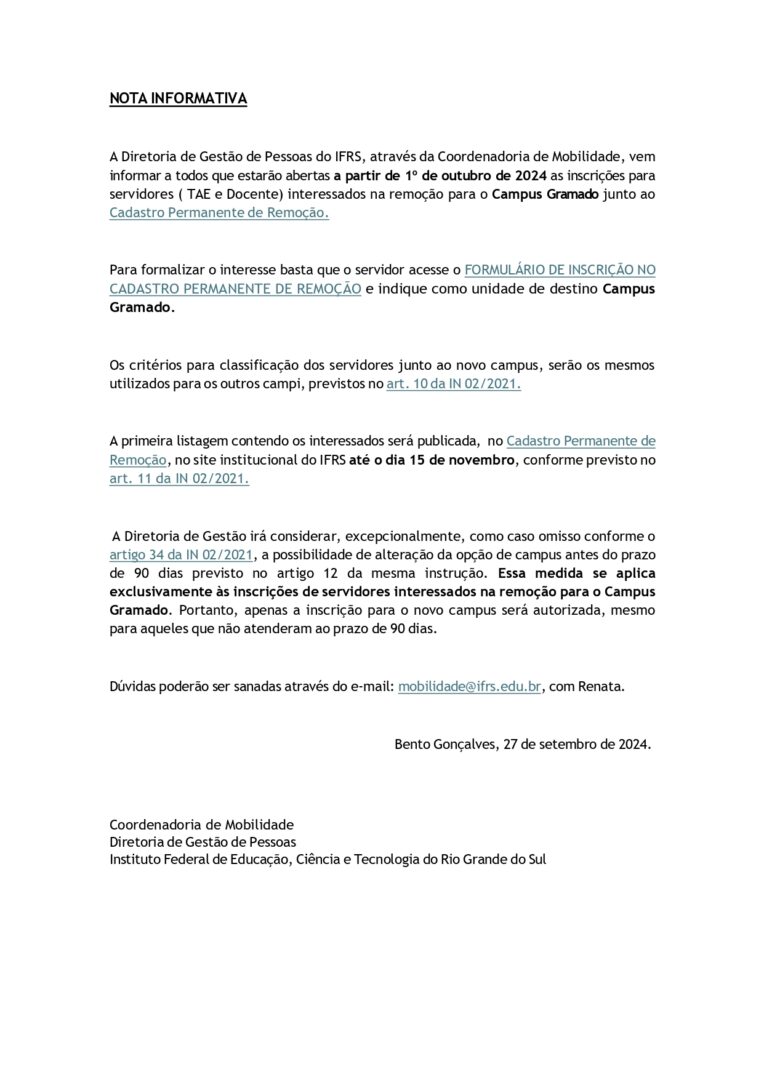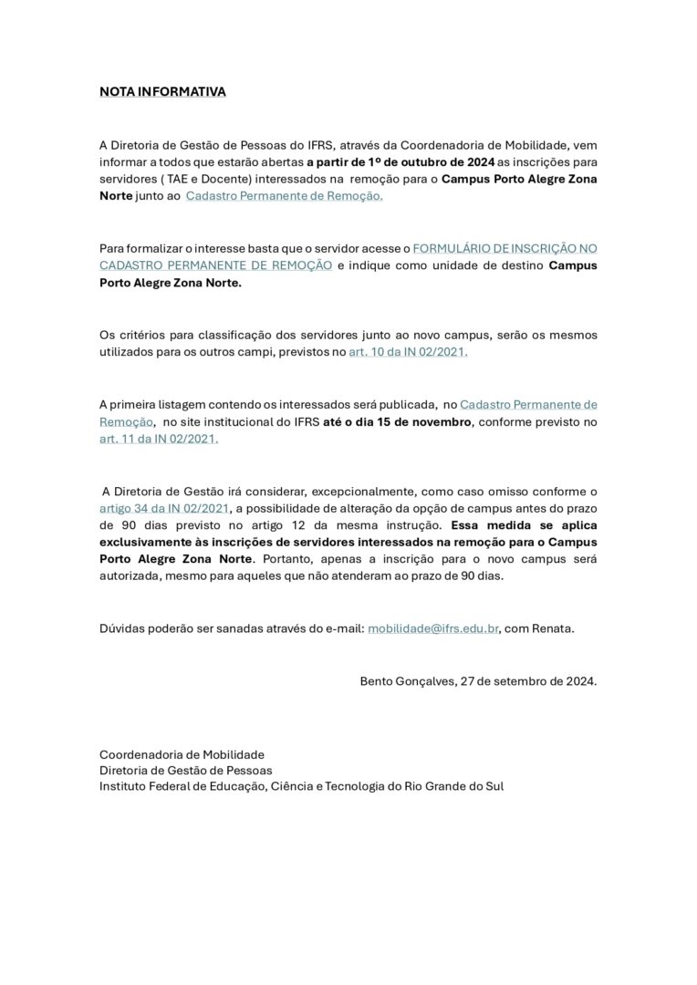 - As inscrições para os novos campi ( POA-Zona Norte e Gramado), permanecerão abertas não findando no mês de outubro. O que irá ocorrer é somente que a primeira lista, será publicada no mês de novembro, mas a partir de agora em todos os meses as listas serão atualizadas. (art. 11 da IN 02/2021).