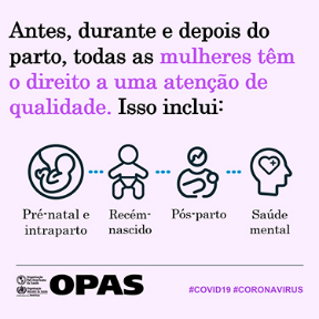 Segundo a Organização Mundial da Saúde (OMS), a gravidez e a amamentação devem receber os mesmos cuidados das recomendações gerais de higiene para prevenção da Covid-19.Todas as mulheres têm o direito a uma experiência de parto positiva, estando ou não contaminadas com o vírus.