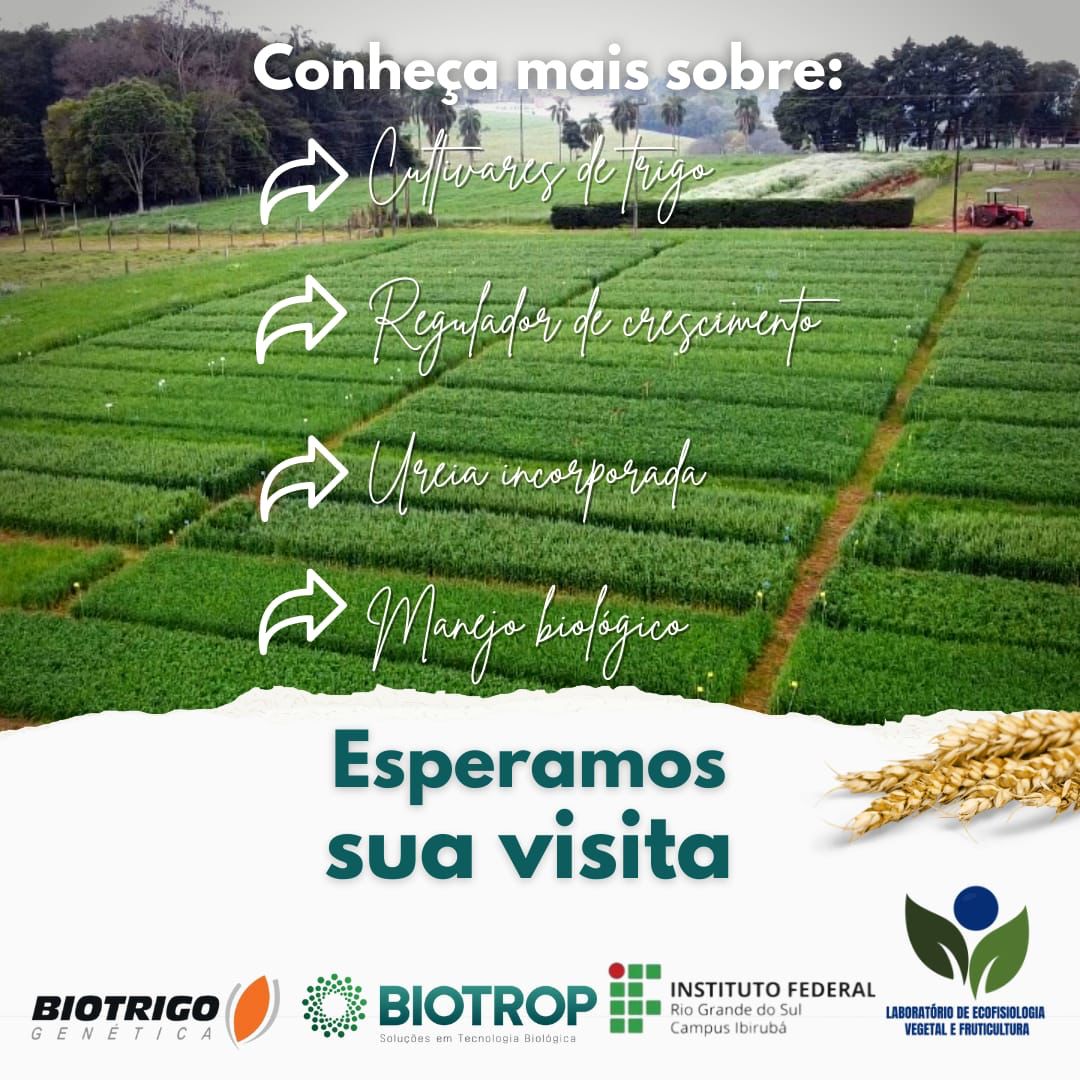Acontecerá na tarde de 14/10/2022, a partir das 13:30, na área didática experimental do IFRS, a 1° Tarde de Campo do IFRS! A ação extensionista é proposta pela docente Bruna Dalcin Pimenta, vinculada ao Edital 16/2022 – Indissociáveis, projeto Avaliação da influência de diferentes formas de aplicação e dosagens de nitrogênio nos caracteres agronômicos da cultura do trigo, aliados ao uso de regulador de crescimento. A ação também tem participação do docente Rodrigo Ludwig, juntamente com seus bolsistas e projetos de pesquisa, além de contar com as empresas Biotrigo Genética e Biotrop, as quais possuem acordo de parceria com o IFRS. Na 1° Tarde de Campo do IFRS serão apresentados os resultados acerca de cultivares de trigo, uso de redutor de crescimento, manejo nitrogenado e manejo biológico. Convidamos a todos para prestigiarem o evento!