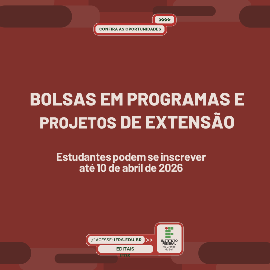 Estudantes do Instituto Federal de Educação, Ciência e Tecnologia do Rio Grande do Sul (IFRS) podem se inscrever, até 10 de abril de 2026, para vagas de bolsistas em programas e projetos de extensão. São ofertadas sete vagas, com carga horária entre 8 e 16 horas semanais, em atividades remotas, conforme o Edital da Pró-Reitoria de Extensão (Proex) nº 09/2026.