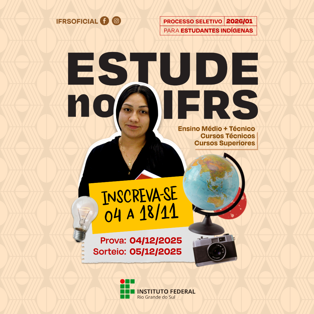 O Instituto Federal de Educação, Ciência e Tecnologia do Rio Grande do Sul (IFRS) está com inscrições abertas para o Processo Seletivo Especial para Ingresso de Estudantes Indígenas no primeiro semestre de 2026. As inscrições podem ser realizadas até 18 de novembro de 2025, exclusivamente pelo site ingresso.ifrs.edu.br.