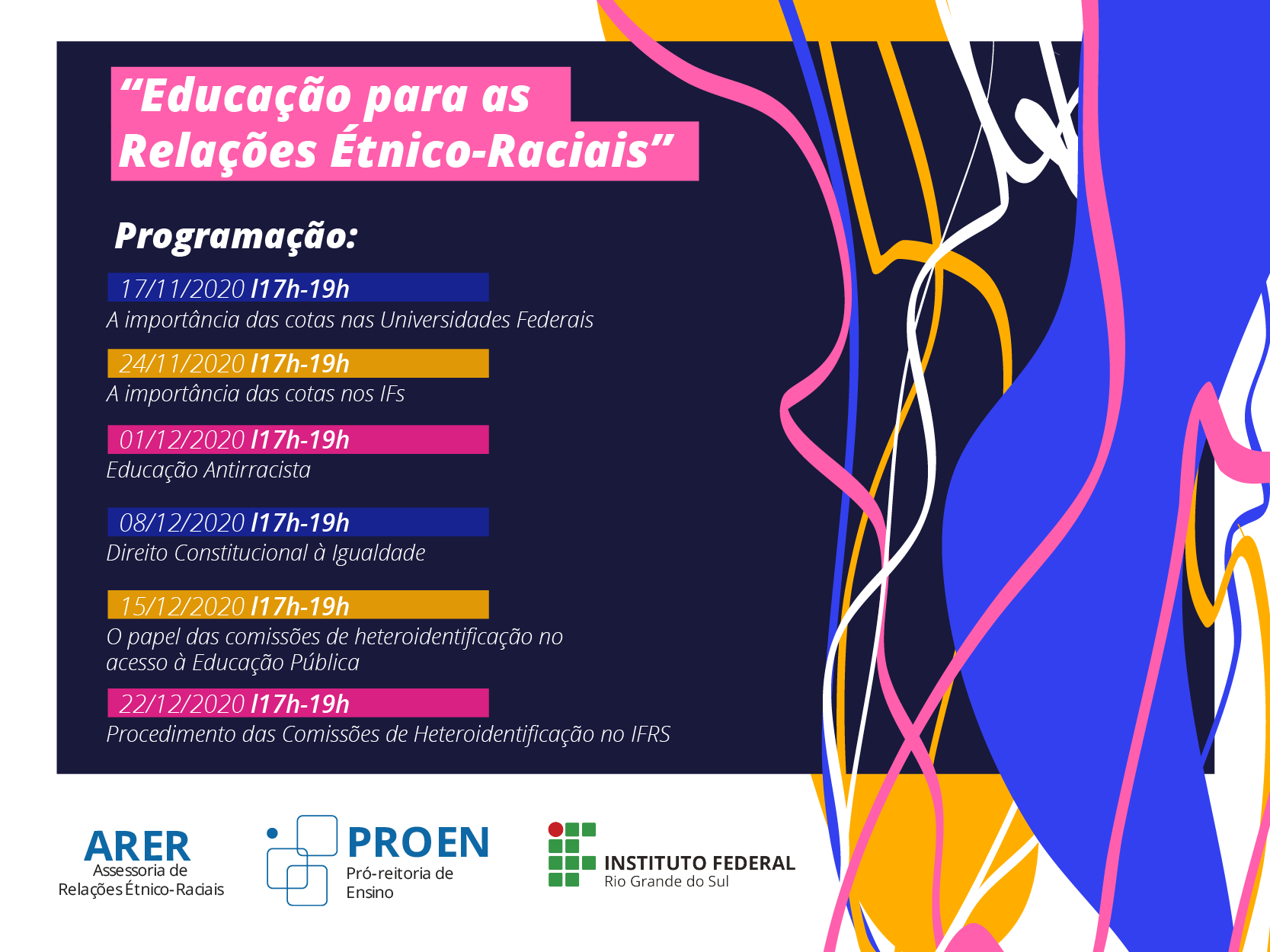 A Assessoria de Relações Étnico-Raciais do Instituto Federal do Rio Grande do Sul (IFRS) realiza o curso de extensão “Educação para as Relações Étnico-Raciais: políticas e conceitos”. Serão seis encontros on-line, nas terças-feiras, às 17h, nos dias 17 e 24 de novembro e 1º, 8, 15 e 22 de dezembro. As inscrições estarão disponíveis sempre até as datas das respectivas mesas temáticas, por meio de formulário eletrônico. Acesse e garanta sua participação.