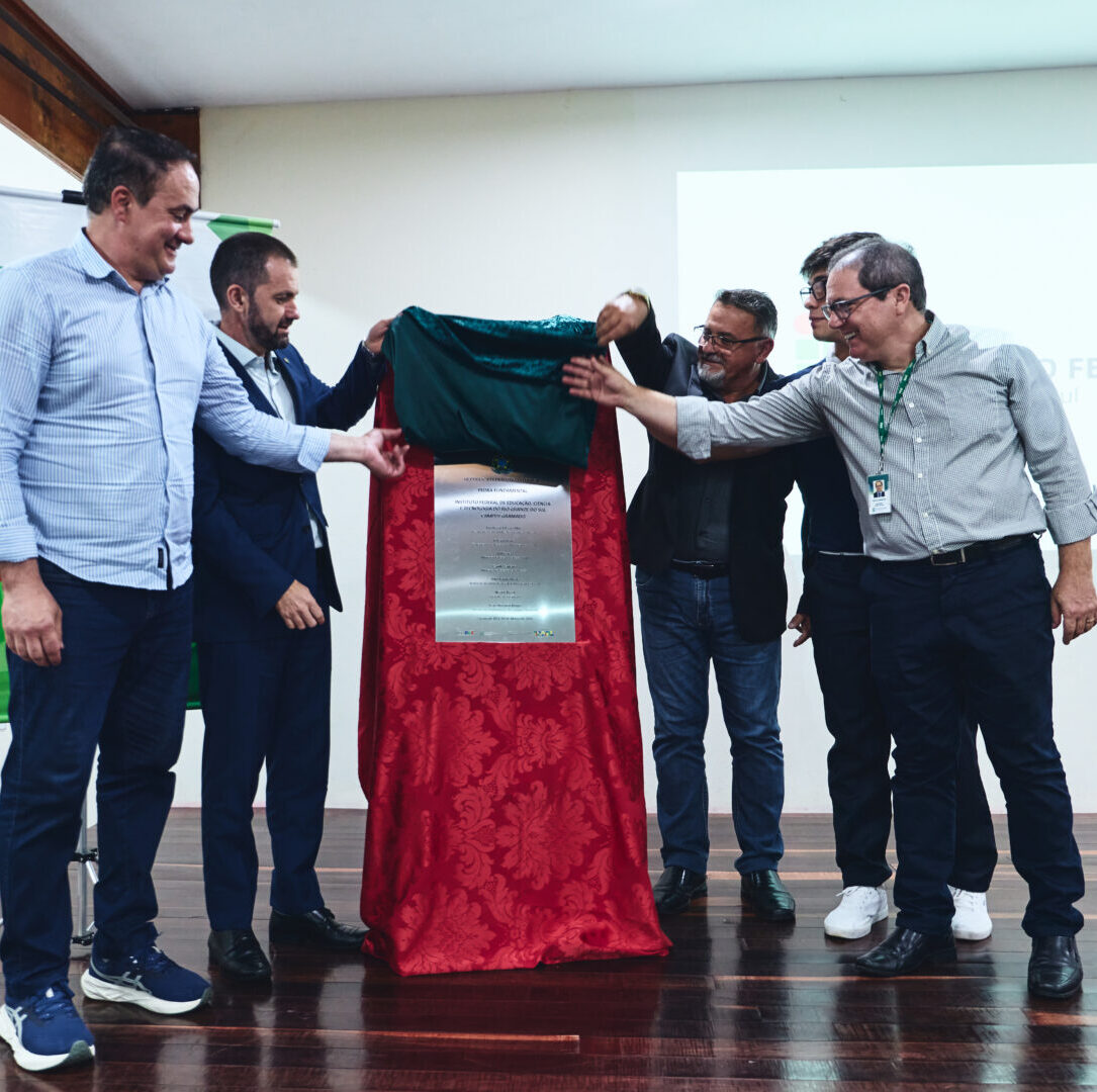 A placa que futuramente será afixada na unidade foi descerrada pelo reitor, Júlio Xandro Heck; juntamente com o diretor de implantação do Campus Gramado, Jesus Rosemar Borges; o secretário municipal de Inovação e Desenvolvimento Econômico, André Castilhos; o presidente da Câmara de Vereadores, Neri Paulo do Nascimento; e o estudante do IFRS – Campus Rolante Kauã Ribeiro de Oliveira, representando os alunos da instituição na solenidade.