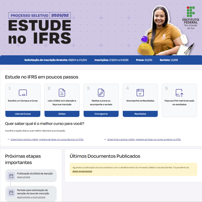 Estão divulgados os resultados dos recursos e os gabaritos definitivos do Processo Seletivo de estudantes do Instituto Federal de Educação, Ciência e Tecnologia do Rio Grande do Sul (IFRS) 2024/02