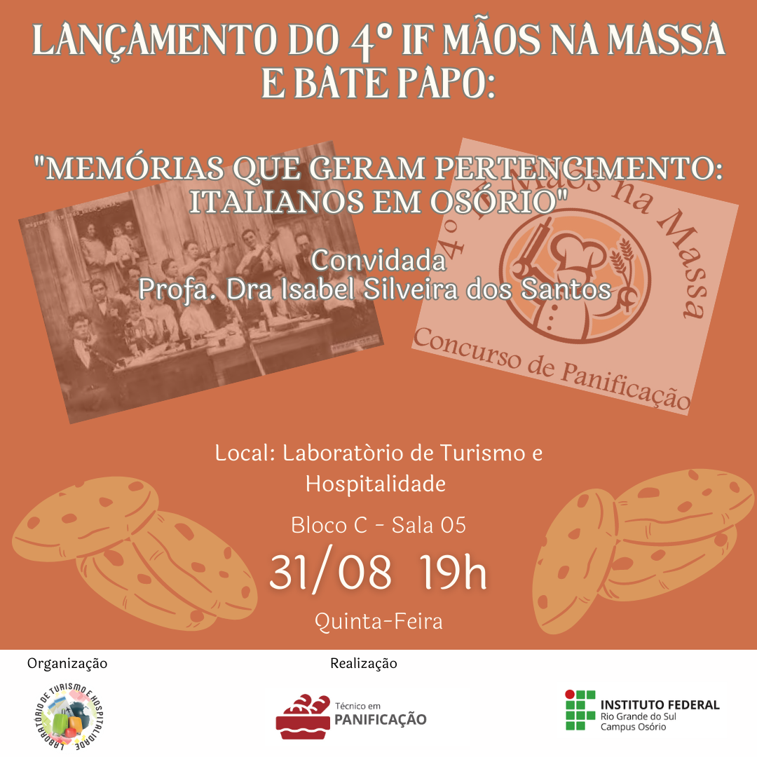 Para contextualizar a temática sobre pães italianos, a professora Doutora Isabel Silveira dos Santos realizará na mesma noite, um bate papo sobre “Memórias que geram pertencimento: italianos em Osório”.