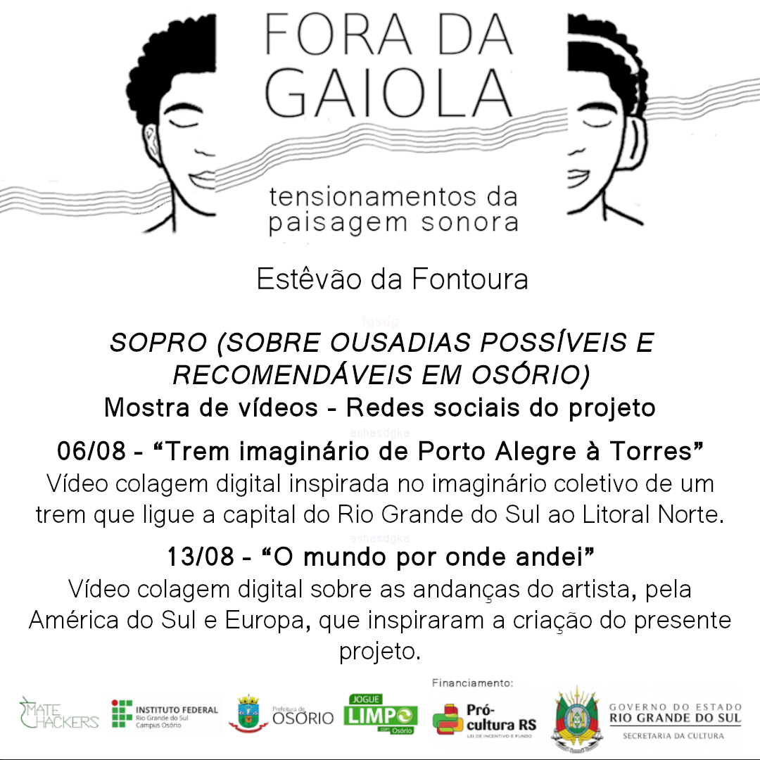 Acompanhe na página do Facebook do projeto Fora da Gaiola mais um audiovisual da Mostra SOPRO (Sobre Ousadias Possíveis e Recomendáveis em Osório). O vídeo traz cenas relacionadas aos sons coletados