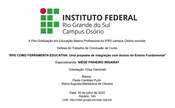 A pesquisa, orientada pela professora Elisa Daminelli, tem como título ‘RPG como ferramenta educativa: Uma proposta de integração com alunos do Ensino Fundamental’. A banca será composta por Maria Augusta Martiarena de Oliveira e Paola Cardoso Purin.