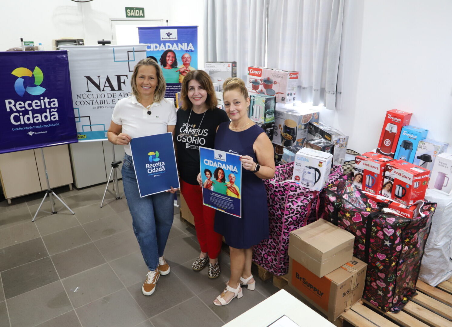 Cerca de 500 itens, num valor total estimado de R$ 157 mil, foram recebidos pelo Campus Osório através de doação do Programa Receita Cidadã, da Receita Federal do Brasil. A entrega simbólica foi realizada na tarde de 15 de abril pela servidora Rosane Medina, da agência de Tramandaí/RS, às coordenadoras Maria Cristina Schefer, de Desenvolvimento Institucional, e Cíntia Renz, do Núcleo de Apoio Contábil e Fiscal (NAF).