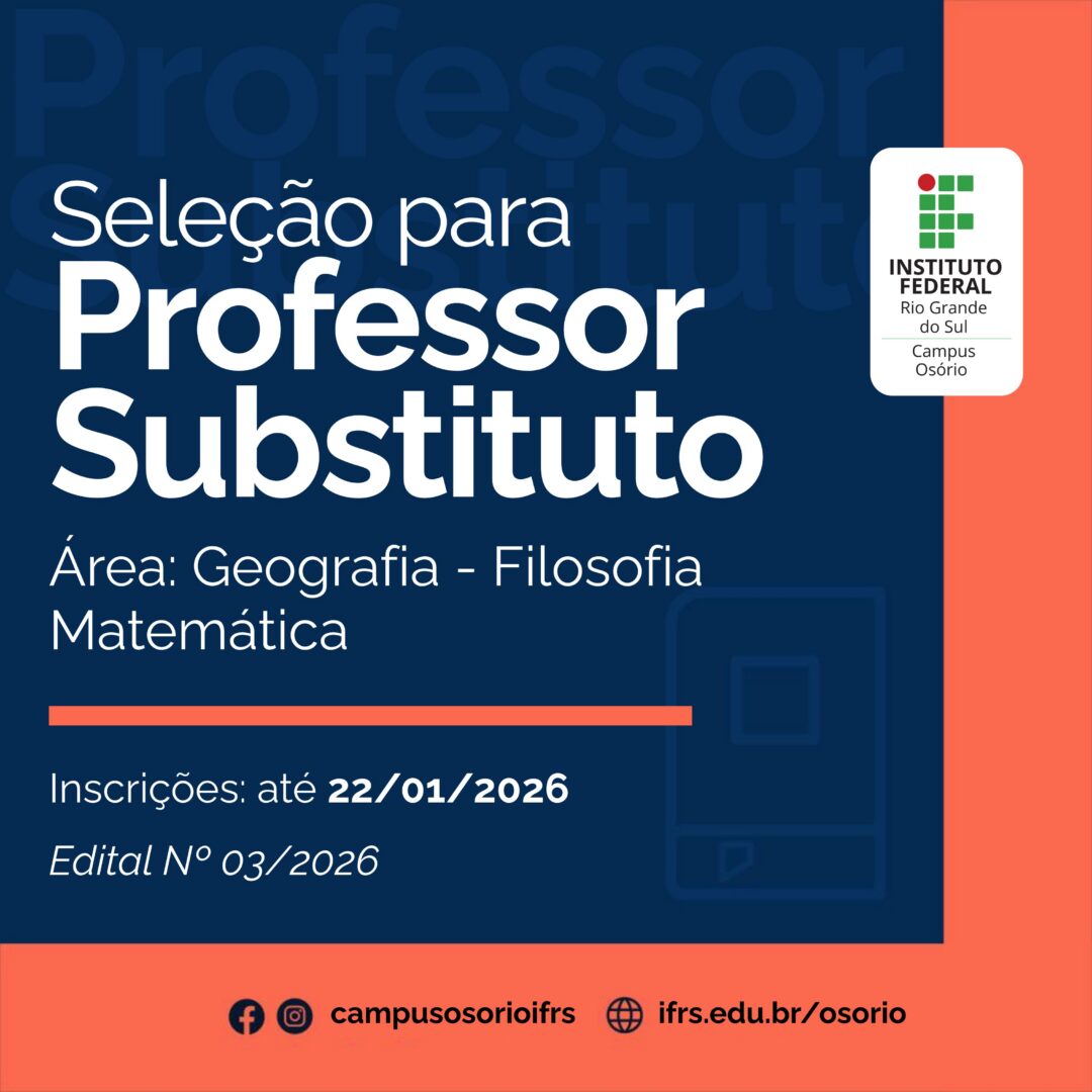 Estão abertas as inscrições para o processo seletivo destinado à contratação de professor substituto para o IFRS – Campus Osório. As vagas são para as áreas de Geografia, Filosofia e Matemática, com exigência de licenciatura na respectiva área ou bacharelado com formação pedagógica. O edital (nº 03/2026), com todas as informações da seleção, está disponível no site do campus, no menu Editais.
