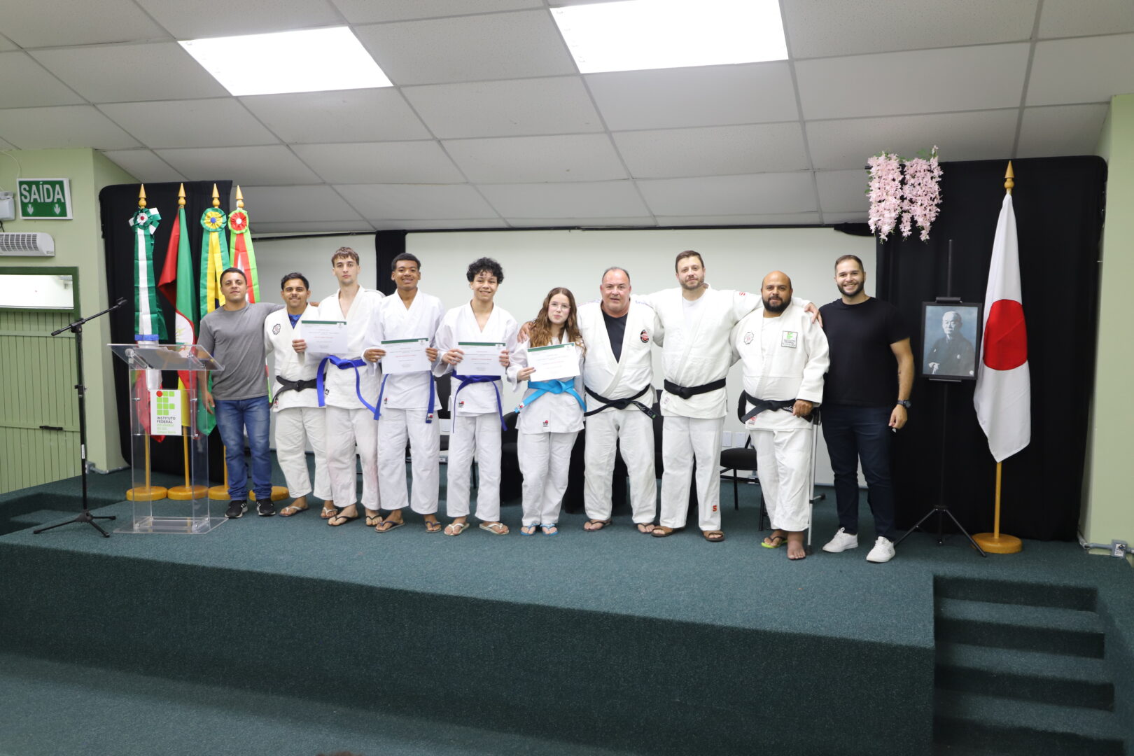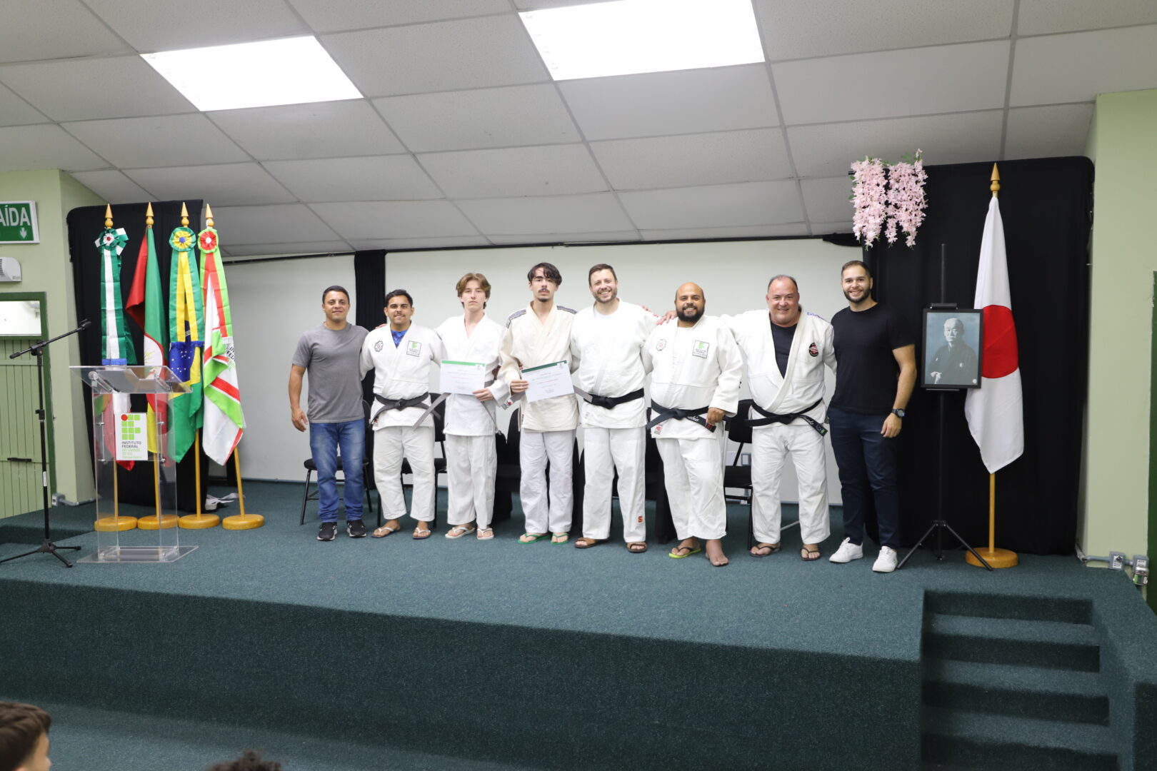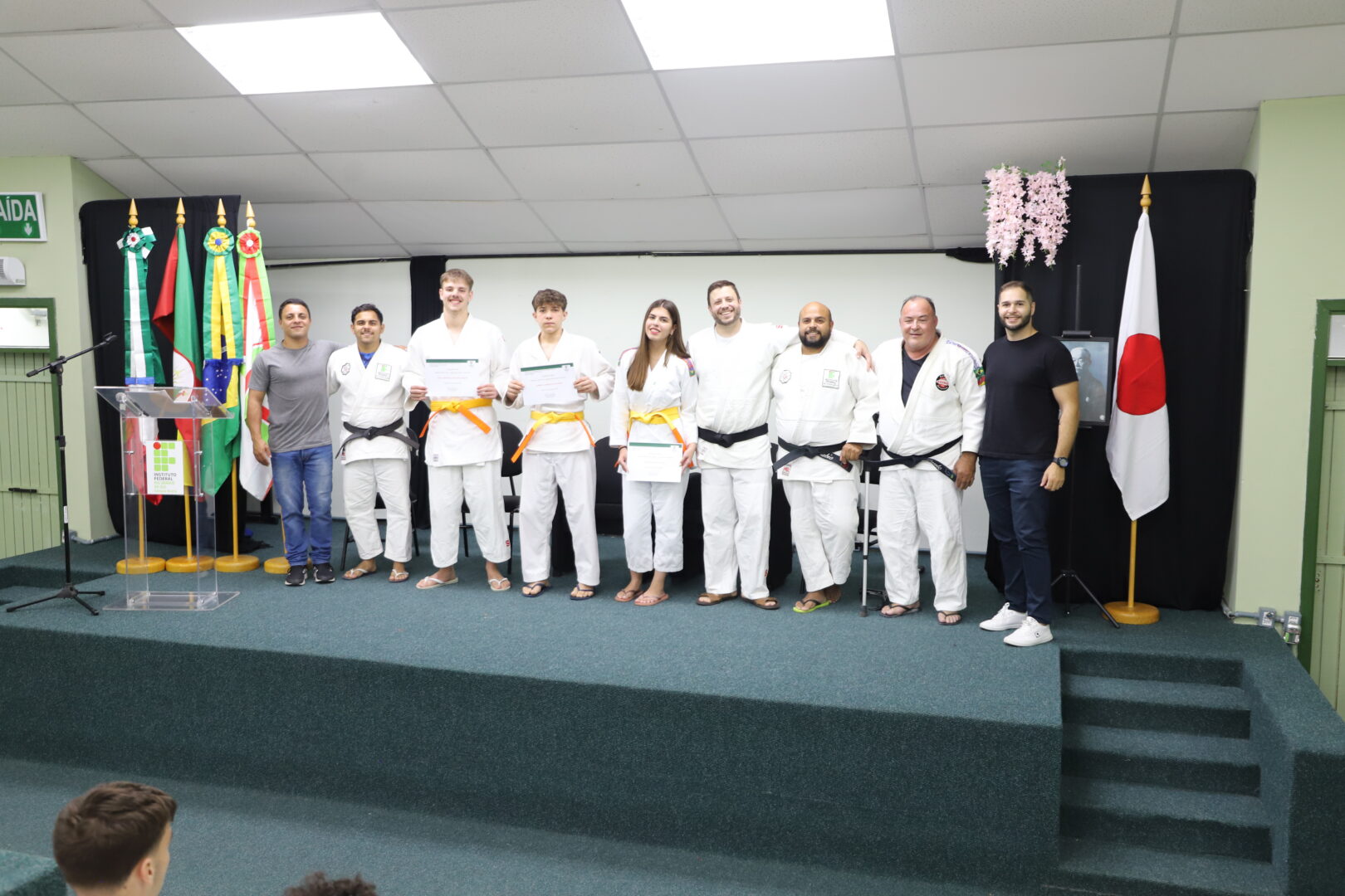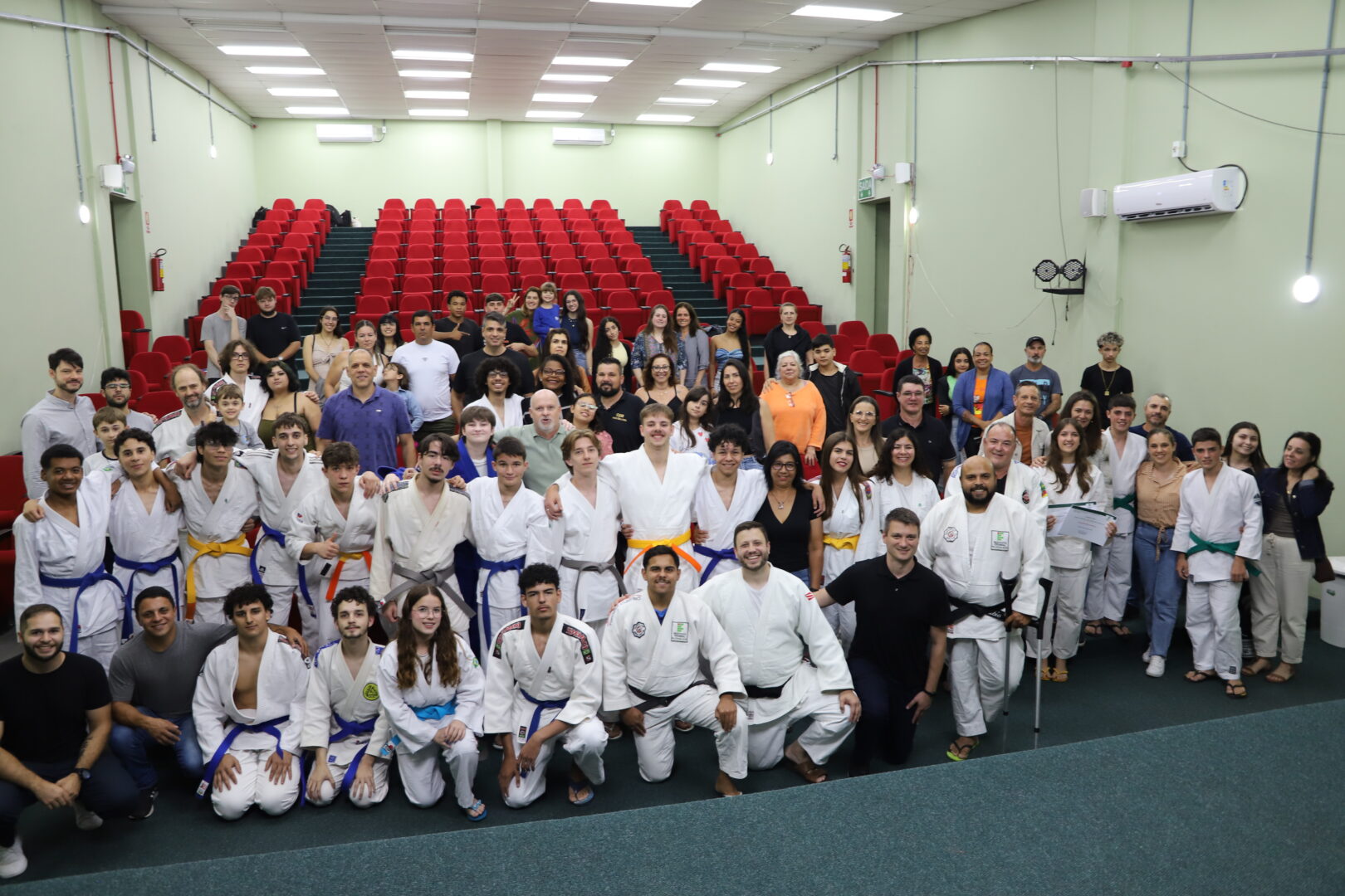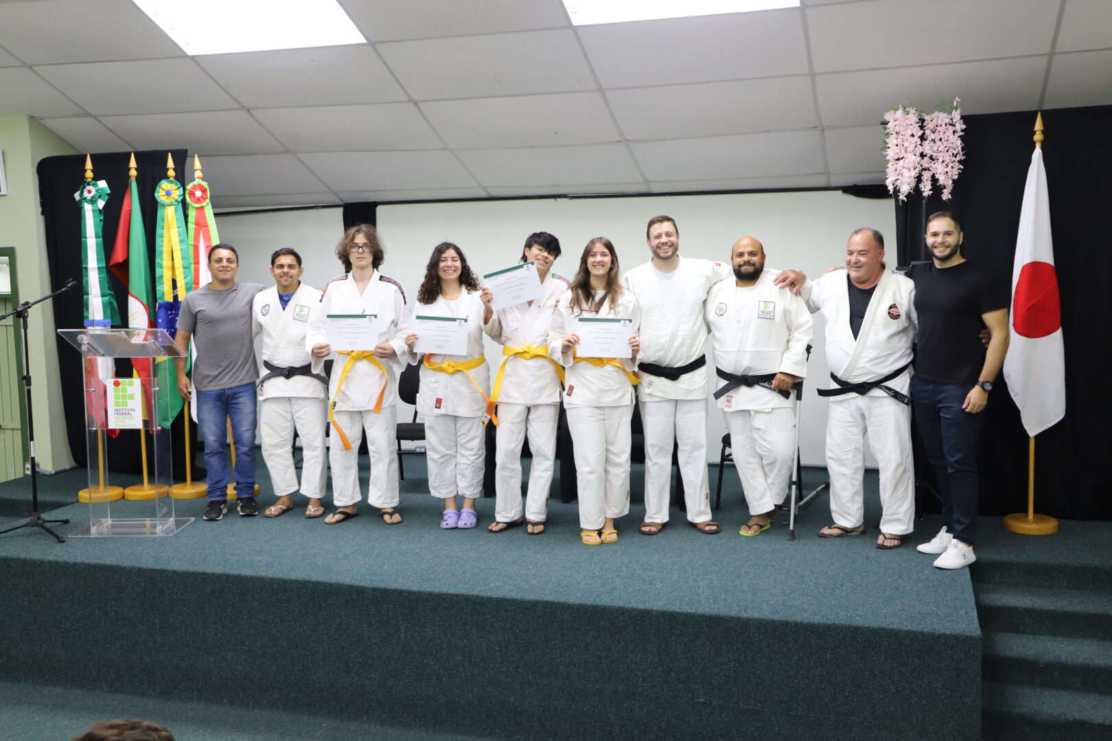 Um grupo de 23 alunos receberam as novas faixas, reconhecidas pela Federação Gaúcha de Judô, na Cerimônia de Graduação da Equipe de Judô (Bonenkai), realizada na última quarta-feira, 26 de novembro de 2025, no auditório Agnes Schmelling, do IFRS – Campus Osório.
