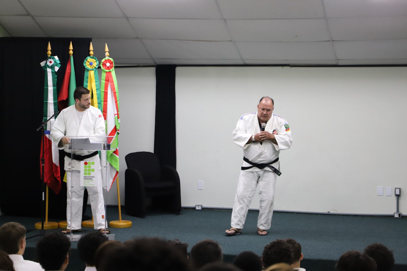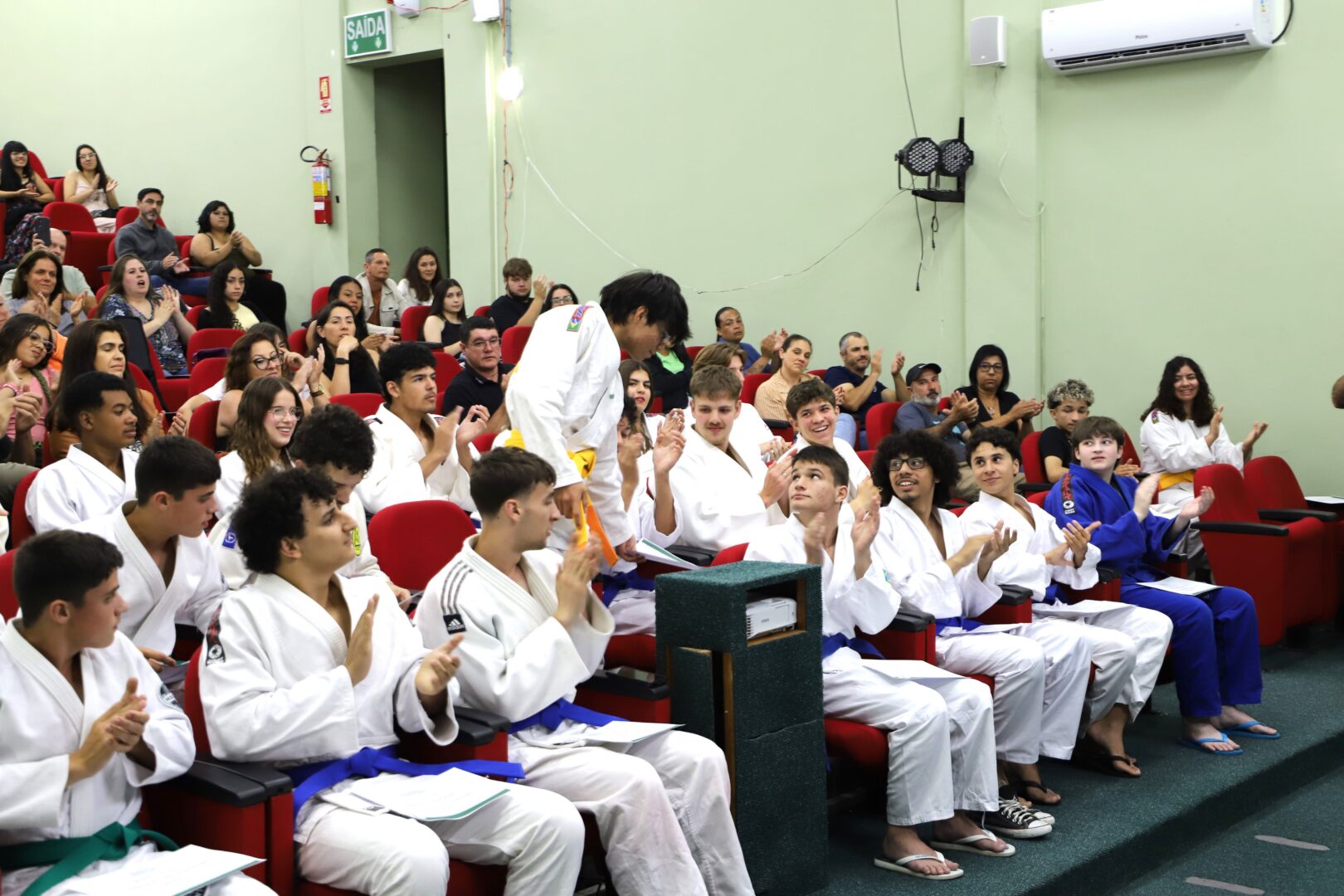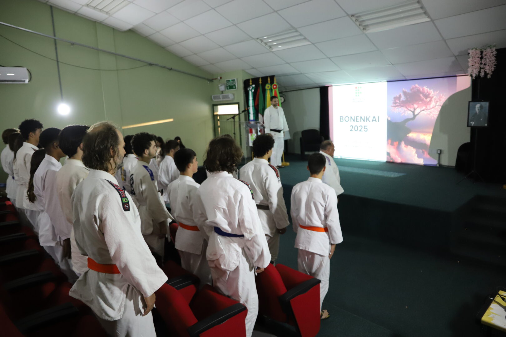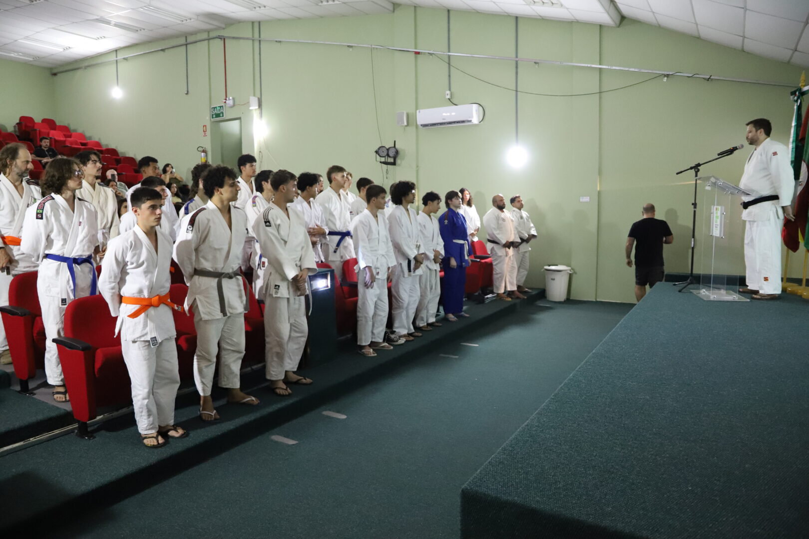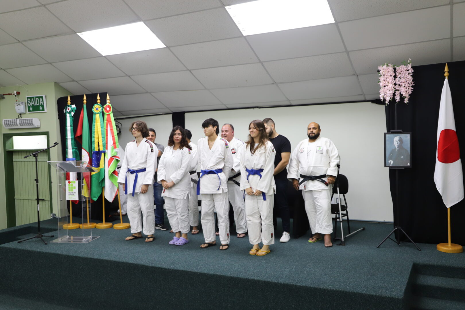 Um grupo de 23 alunos receberam as novas faixas, reconhecidas pela Federação Gaúcha de Judô, na Cerimônia de Graduação da Equipe de Judô (Bonenkai), realizada na última quarta-feira, 26 de novembro de 2025, no auditório Agnes Schmelling, do IFRS – Campus Osório.
