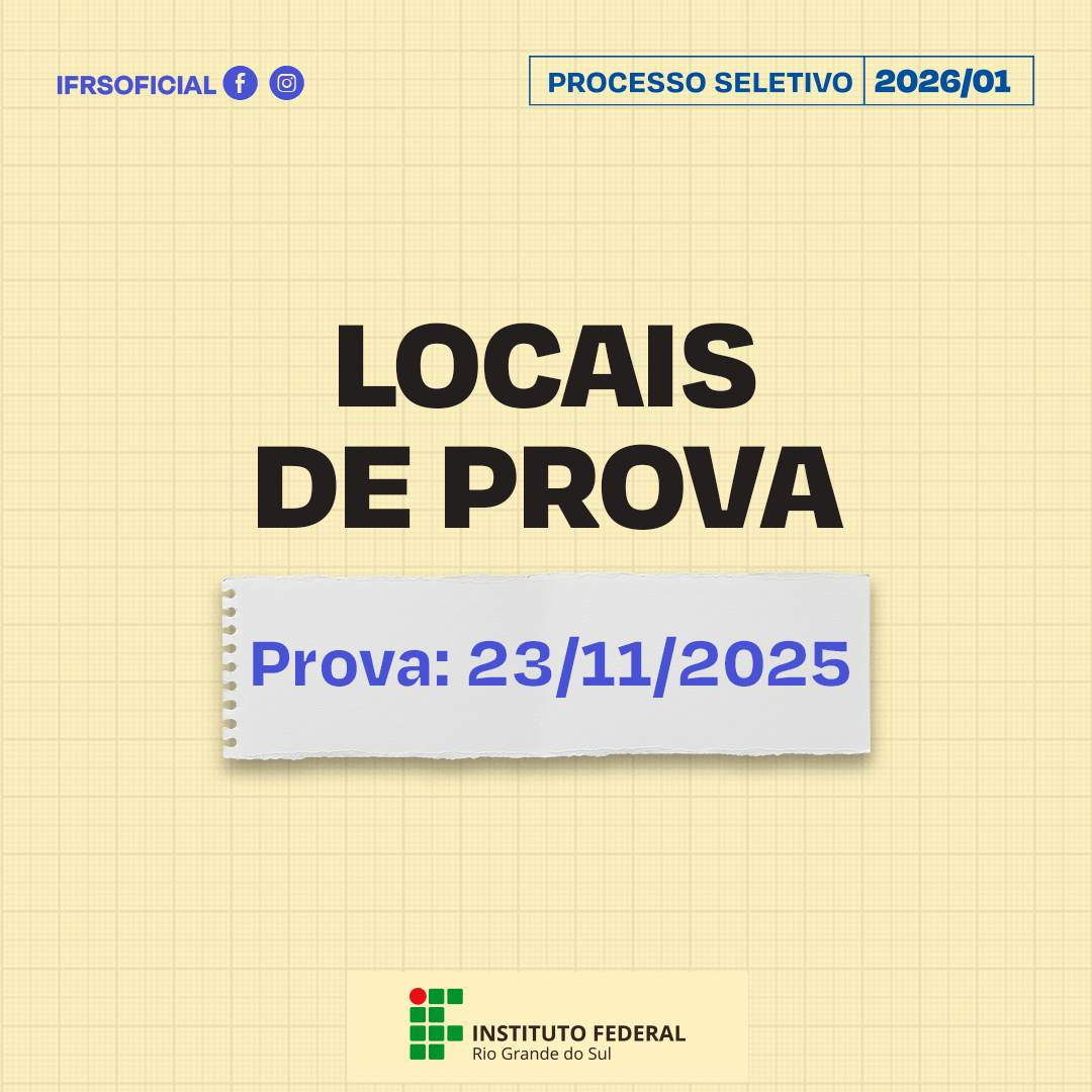 A prova será aplicada nos campi: Bento Gonçalves, Canoas, Caxias do Sul, Erechim, Farroupilha, Feliz, Ibirubá, Osório, Restinga, Rio Grande, Rolante, Sertão, Vacaria e Veranópolis.