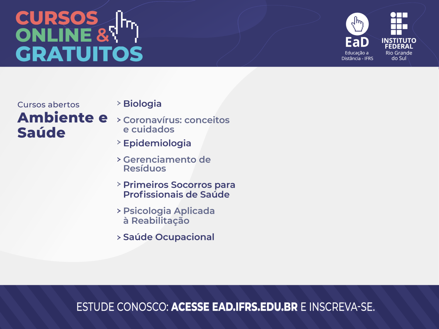 Gostaria de fazer um curso de curta duração totalmente gratuito na área de Ambiente e Saúde? Então, aproveite essa oportunidade que o Instituto Federal do Rio Grande do Sul (IFRS) oferece! São sete cursos, com aulas abertas a todos os interessados (não é necessário ser estudante do IFRS) e realizadas em ambiente virtual. Não há encontros presenciais ou com hora marcada, ou seja, o estudante faz o curso quando tiver disponibilidade. Ao término, é concedido certificado para os aprovados.
