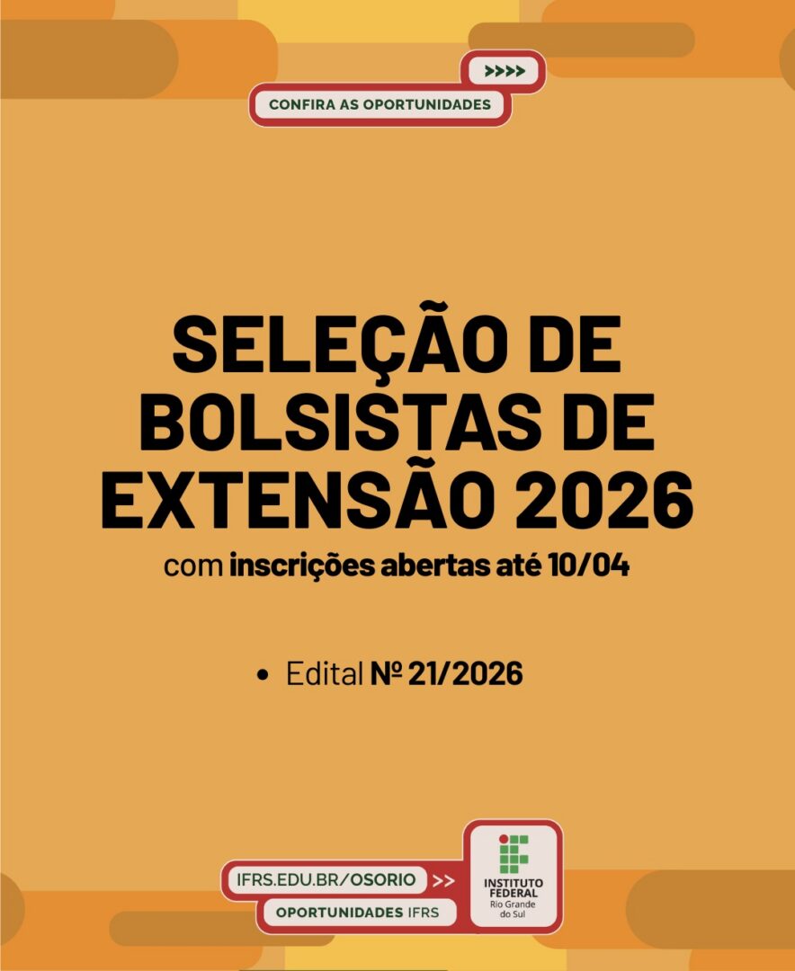 Estudantes interessados em atuar nas ações de extensão do Campus Osório têm até o dia 10 de abril de 2026 para submeter a sua inscrição. São 27 vagas, distribuídas em 19 projetos. As inscrições devem ser feitas por formulário online e os documentos referentes à seleção constam no Edital Nº 21/2026 – onde estão todas as informações sobre os processos de seleção.