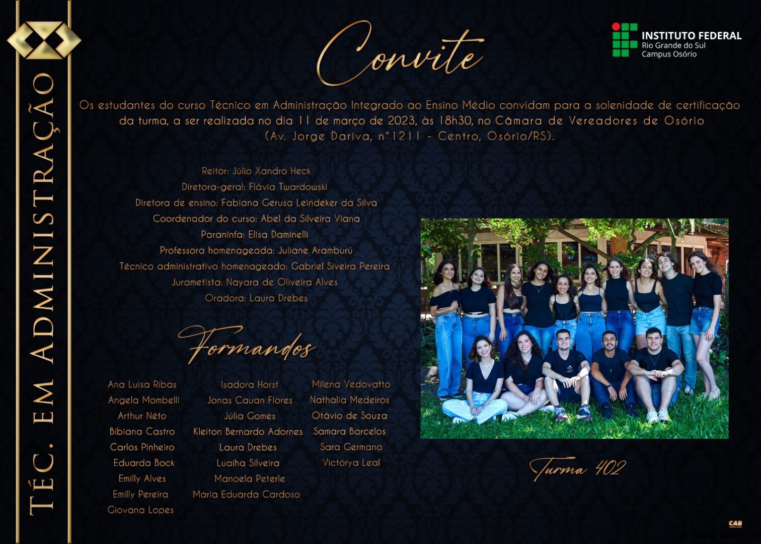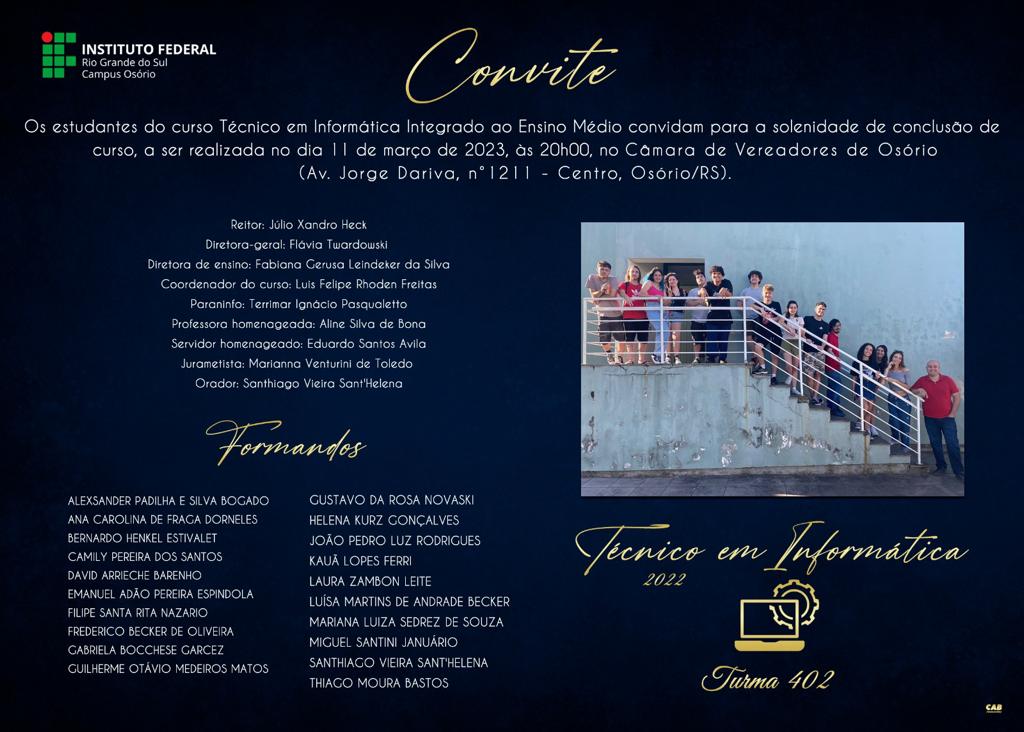 Ainda, no dia 11 de março de 2023 os estudantes dos cursos Integrados ao Ensino Médio (Técnico em Informática e Técnico em Administração) receberão seus certificados de conclusão. Ambas as cerimônias serão realizadas no auditório da Câmara de Vereadores de Osório, Plenário Francisco Maineri. Na tarde de 7 de março, os concluintes do curso de Licenciatura em Letras e Tecnologia em Processos Gerenciais, participam do ato solene de outorga de grau em gabinete, no Campus Osório.