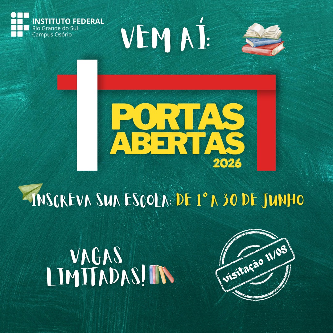 As escolas da região já podem começar a se organizar, pois em junho abrem as inscrições para o programa Portas Abertas, no qual estudantes concluintes dos ensinos fundamental e médio participam de atividades para conhecer o Campus Osório. Neste ano, as visitações guiadas ocorrerão no dia 11 de agosto. Mas fique atento ao período de inscrições, que vão de 1º a 31 de junho de 2026.