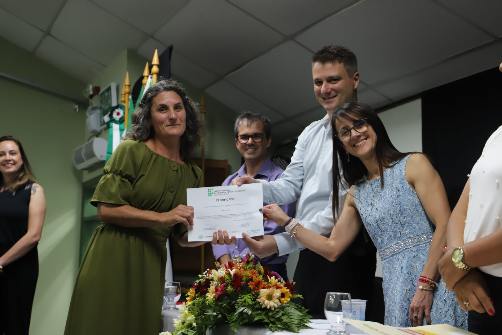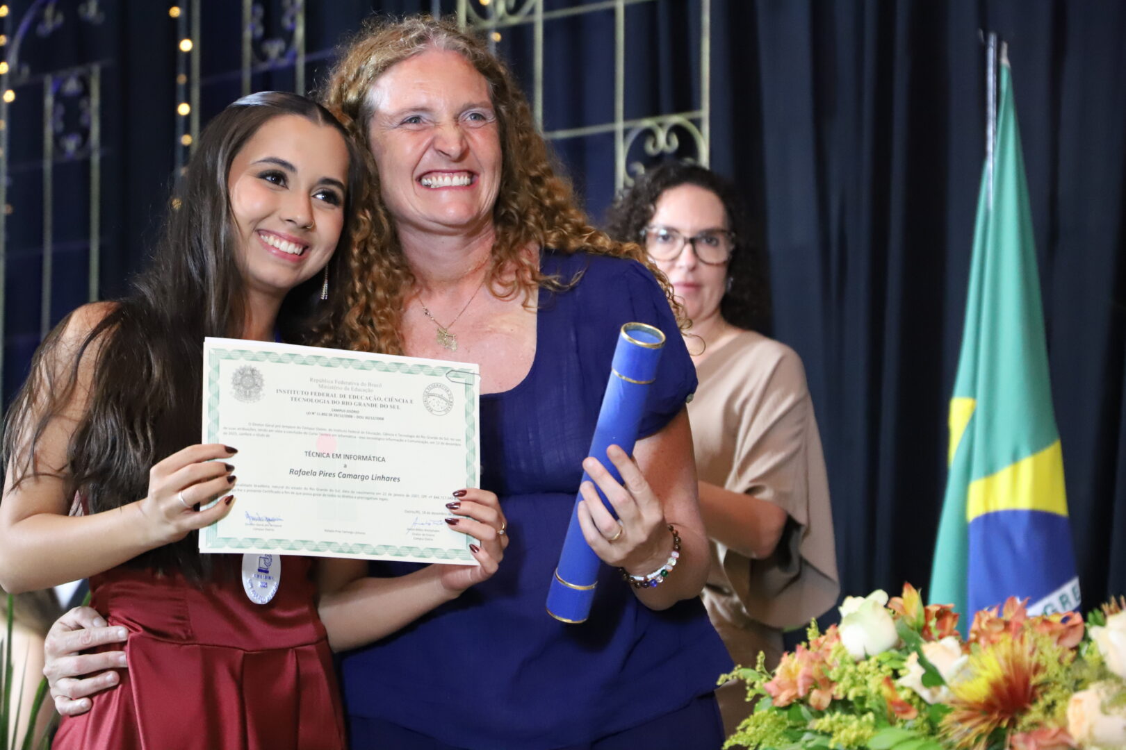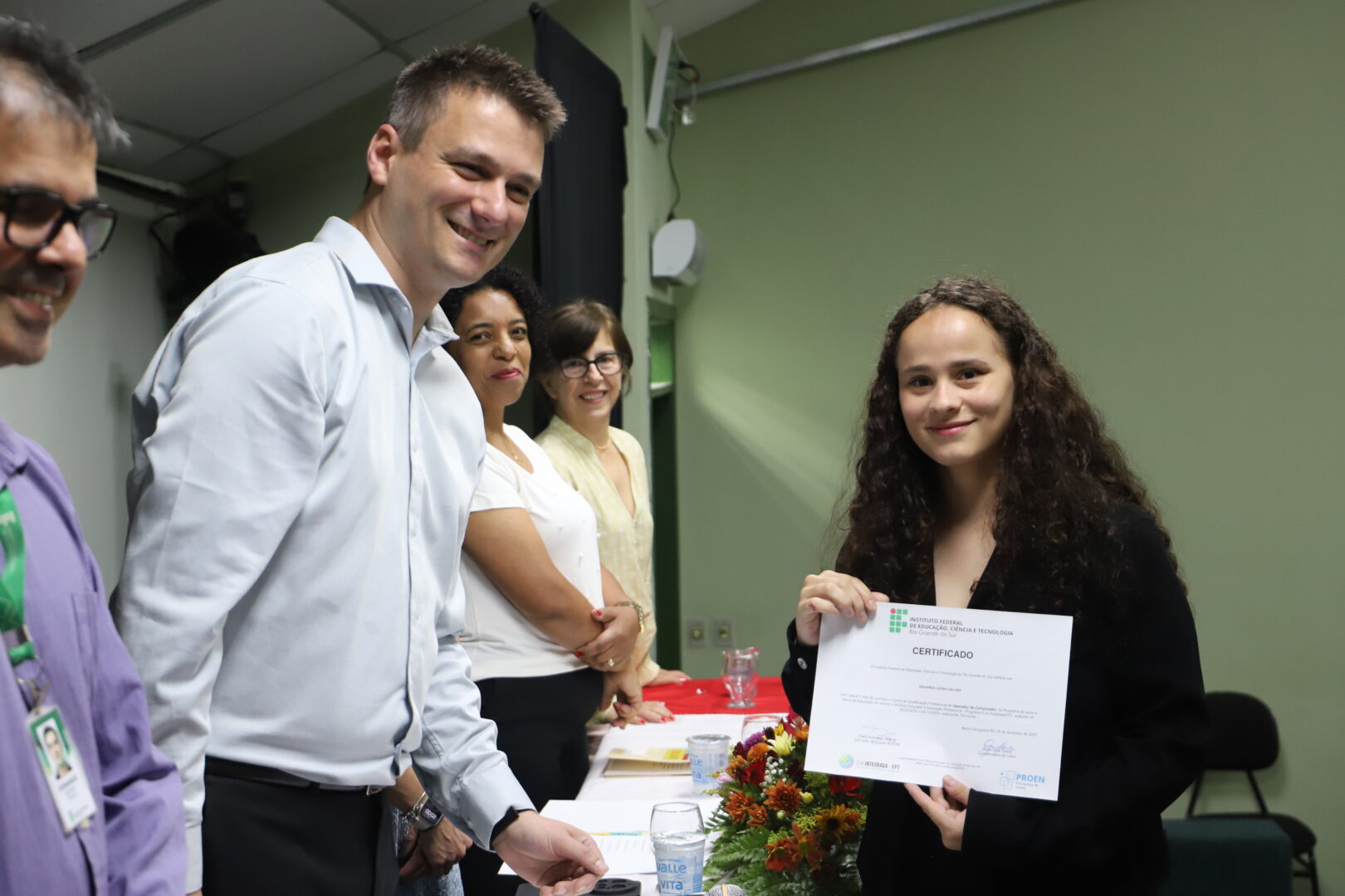 Também se fizeram presentes na solenidade os professores Bruno Chagas Alves Fernandes, Thais Ramos Viegas e Maria Cristina Schefer; a técnica-administrativa de permanência e êxito, Vera Marisa Gasparetto; e a voluntária Maria Eduarda Batistel da Silva Borba, estudante do curso Técnico em Informática Integrado ao Ensino Médio, carinhosamente chamada de anja pelo apoio que deu turma.