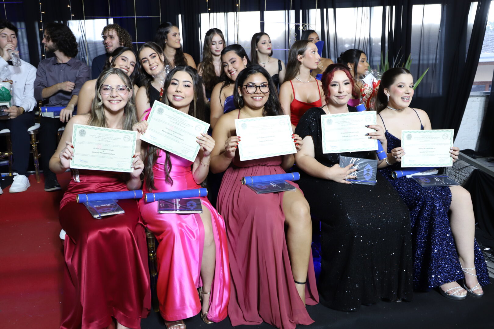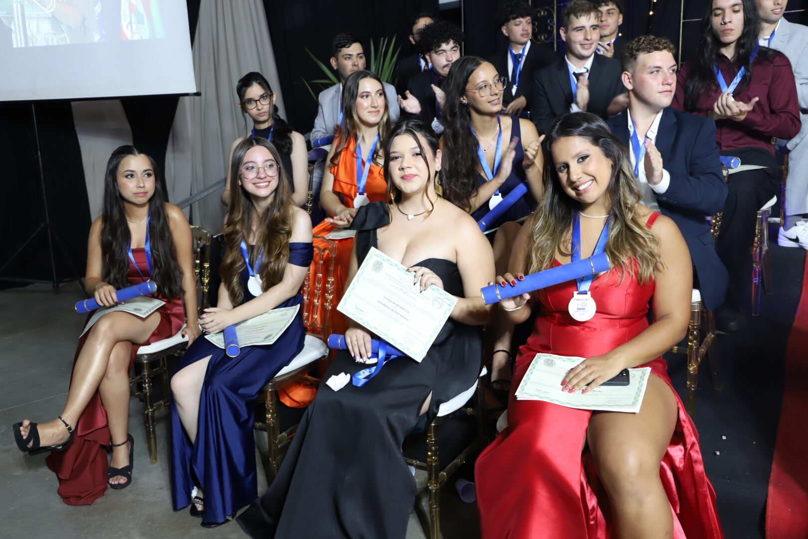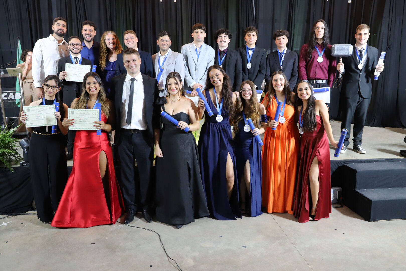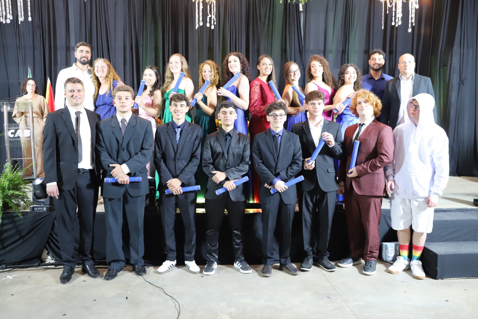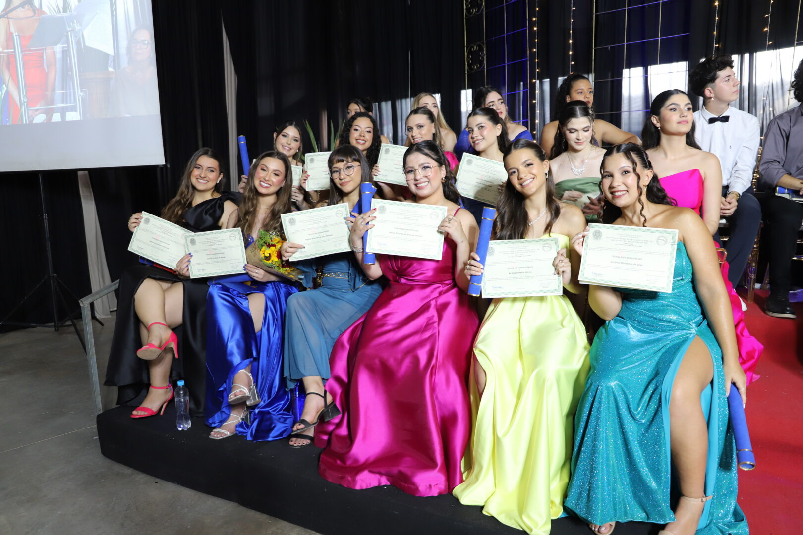 Ao final, também foram chamados ao palco para uma foto, os estudantes formandos que acompanhavam a solenidade e aplaudiam com carinho seus colegas de curso.