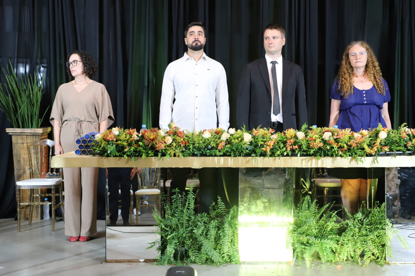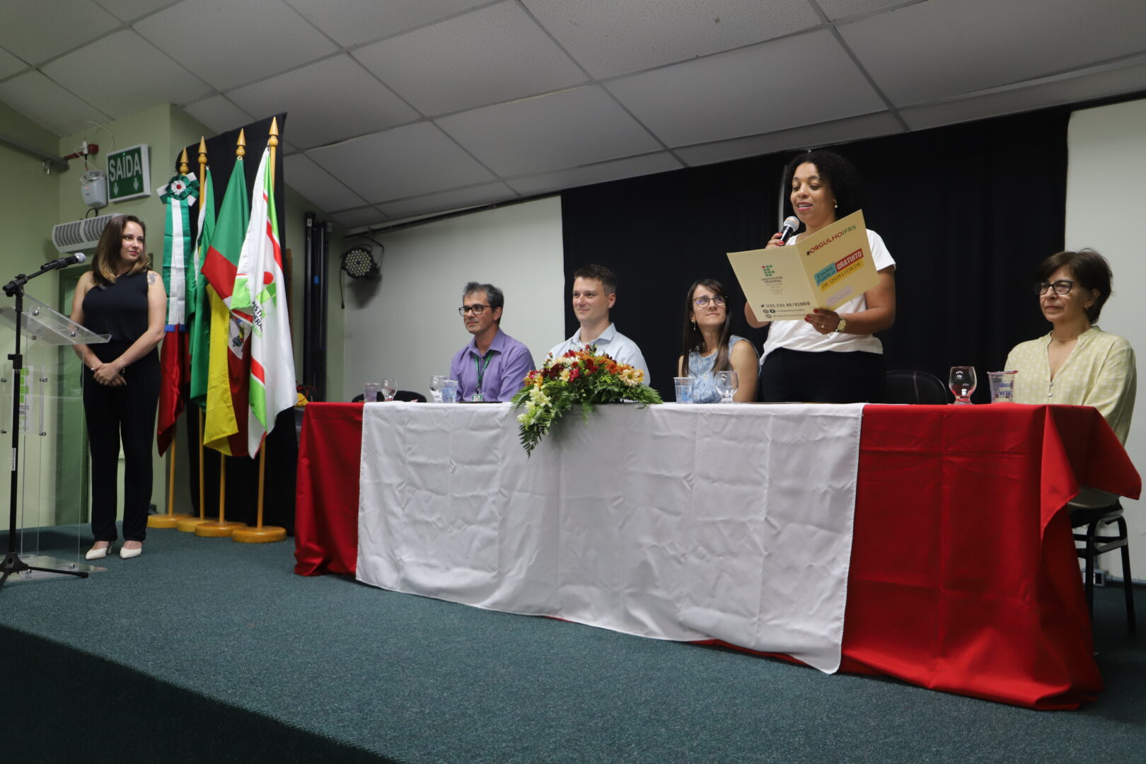 Formaram a mesa de honra da cerimônia de conclusão de curso, a pró-reitora de pesquisa, pós-graduação e inovação, professora Flávia Twardoski; o diretor-geral pró-tempore, professor Marcelo Paravisi; a vice-diretora da Escola Albatroz, professora Vânia Quintanilha Martins; o coordenador-geral do Programa da Educação de Jovens e Adultos Intregrada à Educação Profissional no IFRS, Fernando Loris Ortolan; e a coordenadora do curso, Giane Silva Santos.